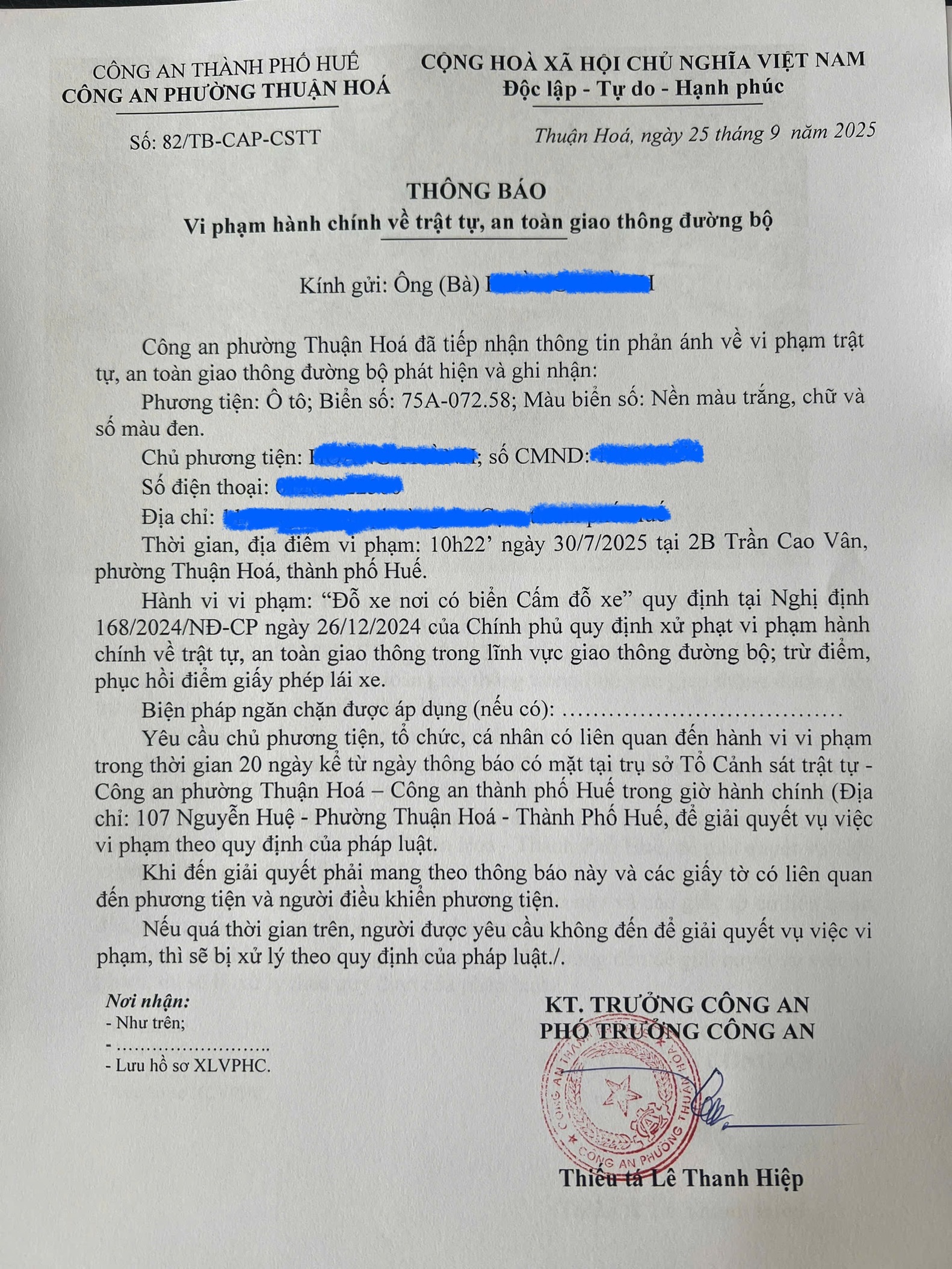 Công an phường Thuận Hóa đã lập hồ sơ, thông báo chủ phương tiện đến làm việc. Nếu quá ngày hẹn mà chủ phương tiện vẫn chưa đến trình diện tại cơ quan. Công an phường Thuận Hóa sẽ gửi thông báo cho cơ quan đăng kiểm để đưa phương tiện vào cảnh báo trên Chương trình Quản lý kiểm định.