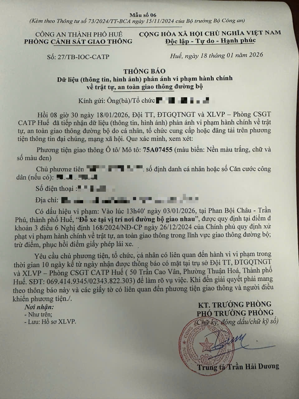 Qua hình ảnh phản ánh, Phòng Cảnh sát giao thông xác định lỗi vi phạm của người điều khiển phương tiện 75A07455 như sau: Đỗ xe tại vị trí nơi đường bộ giao nhau, quy định tại điểm đ, khoản 3, điều 6 Nghị định 168/2024/NĐ-CP.