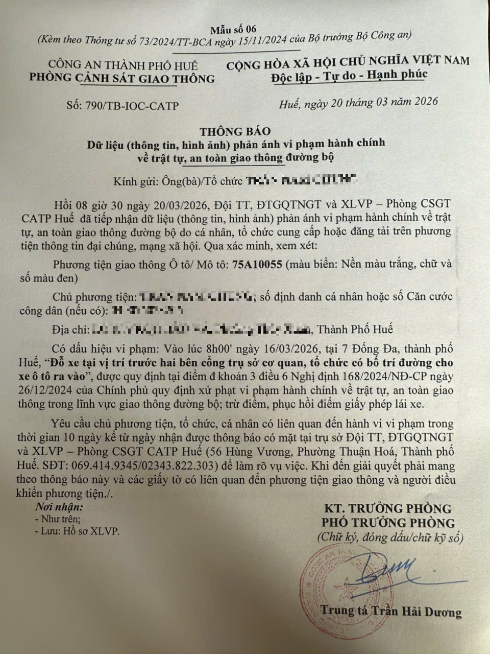 Qua hình ảnh phản ánh, Phòng Cảnh sát giao thông xác định lỗi vi phạm của người điều khiển phương tiện 75A10055 như sau: “Đỗ xe tại vị trí trước hai bên cổng trụ sở cơ quan, tổ chức có bố trí đường cho xe ô tô ra vào”, quy định tại điểm đ, khoản 3, điều 6 Nghị định 168/2024/NĐ-CP.