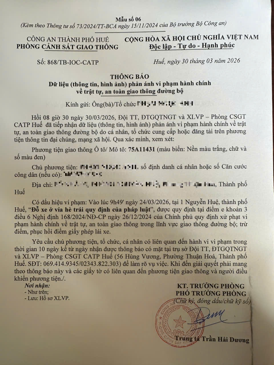 Qua hình ảnh phản ánh, Phòng Cảnh sát giao thông xác định lỗi vi phạm của người điều khiển phương tiện 75A11431 như sau: “Đỗ xe ở vỉa hè trái quy định của pháp luật”, quy định tại điểm e, khoản 3, điều 6 Nghị định 168/2024/NĐ-CP.