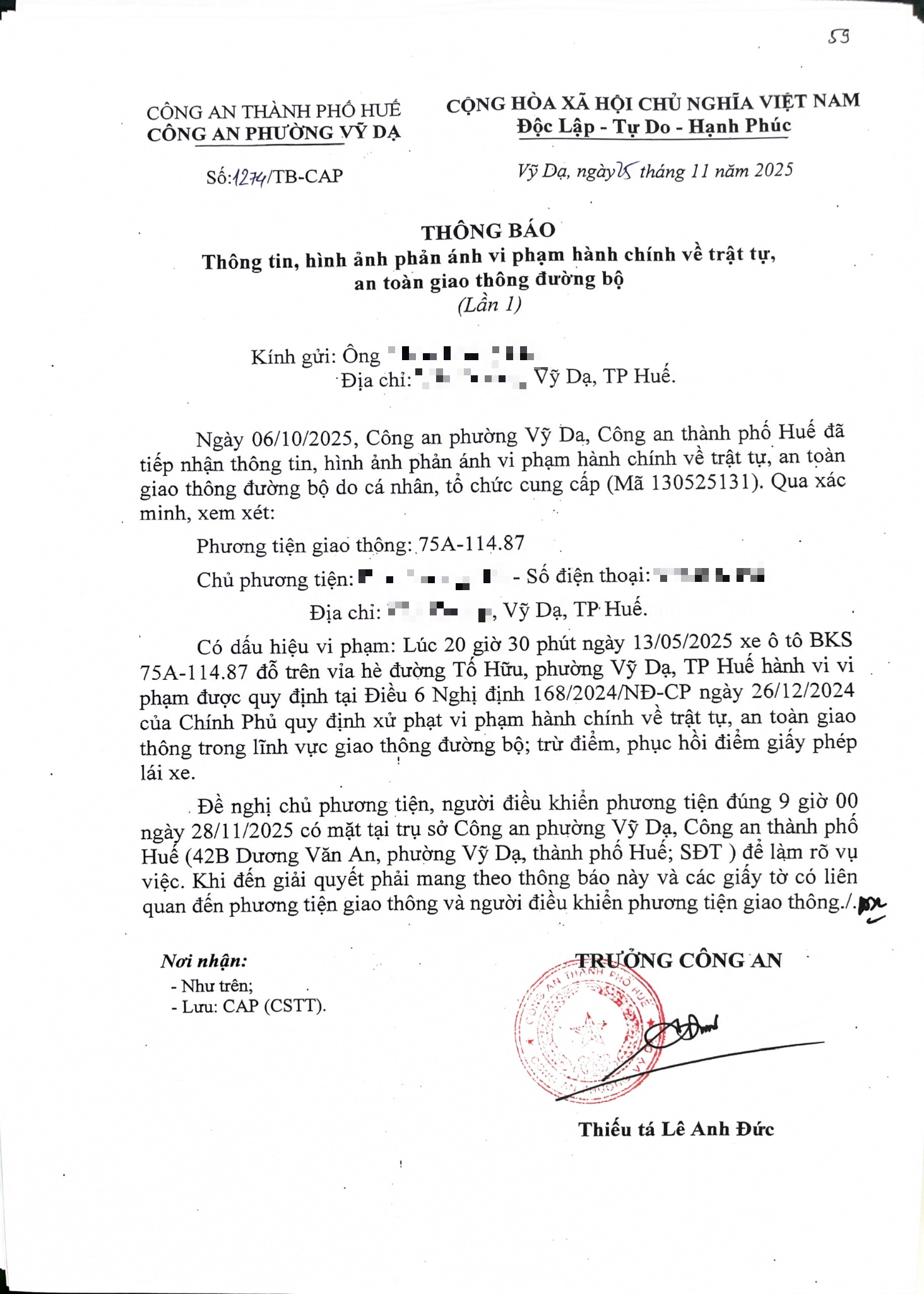 Công an phường Vỹ Dạ đã lập hồ sơ, thông báo chủ phương tiện đến làm việc. Tuy nhiên hiện chủ phương tiện vẫn chưa trình diện tại cơ quan. Công an phường Vỹ Dạ sẽ tiếp tục tăng cường thực hiện công tác tuần tra trên địa bàn, kịp thời phát hiện, xử lý các hành vi vi phạm theo quy định.