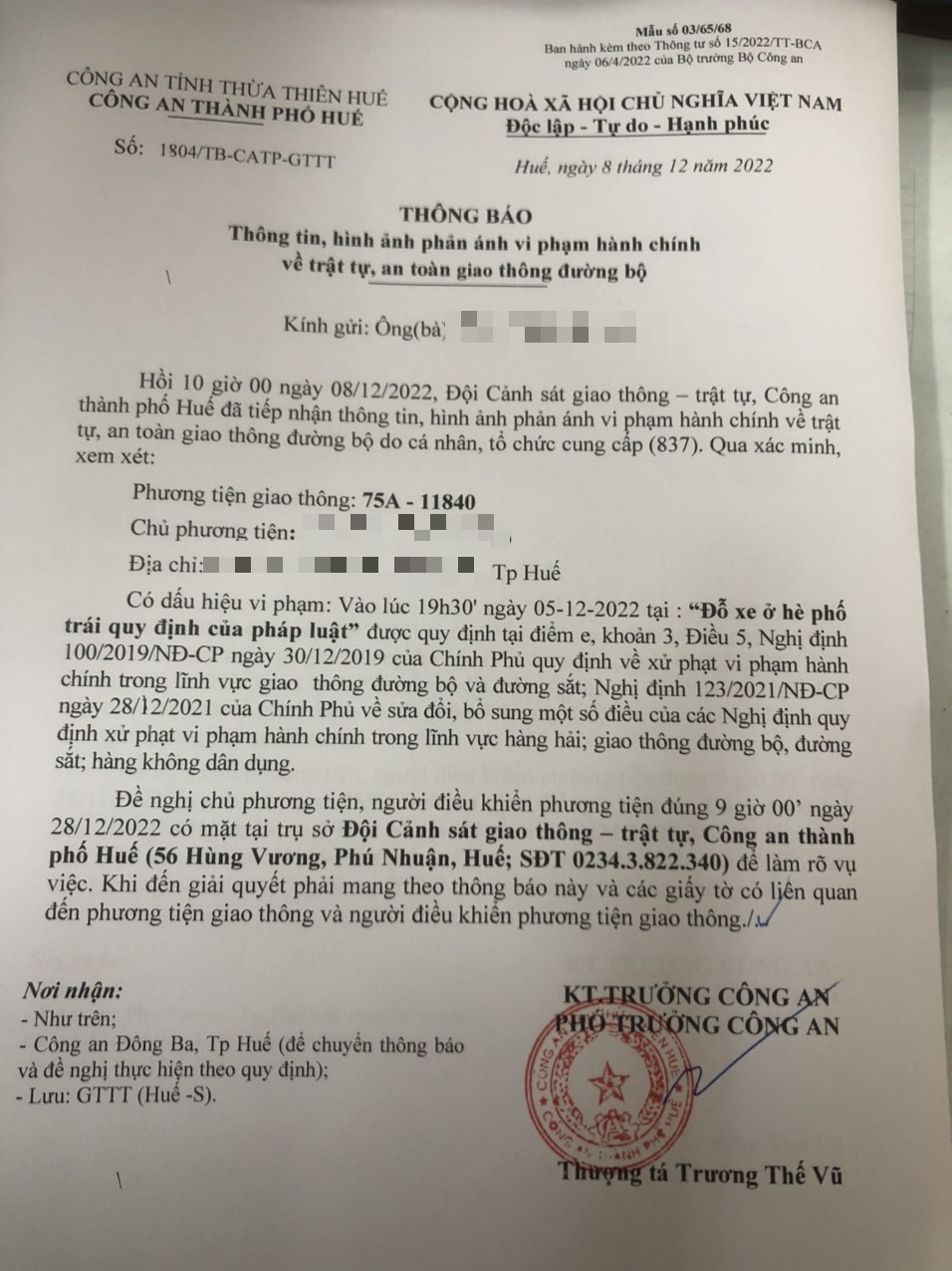 Vấn đề Ông/Bà phản ánh, Công an tỉnh đã chỉ đạo Công an thành phố Huế xin thông báo kết quả xử lý như sau: