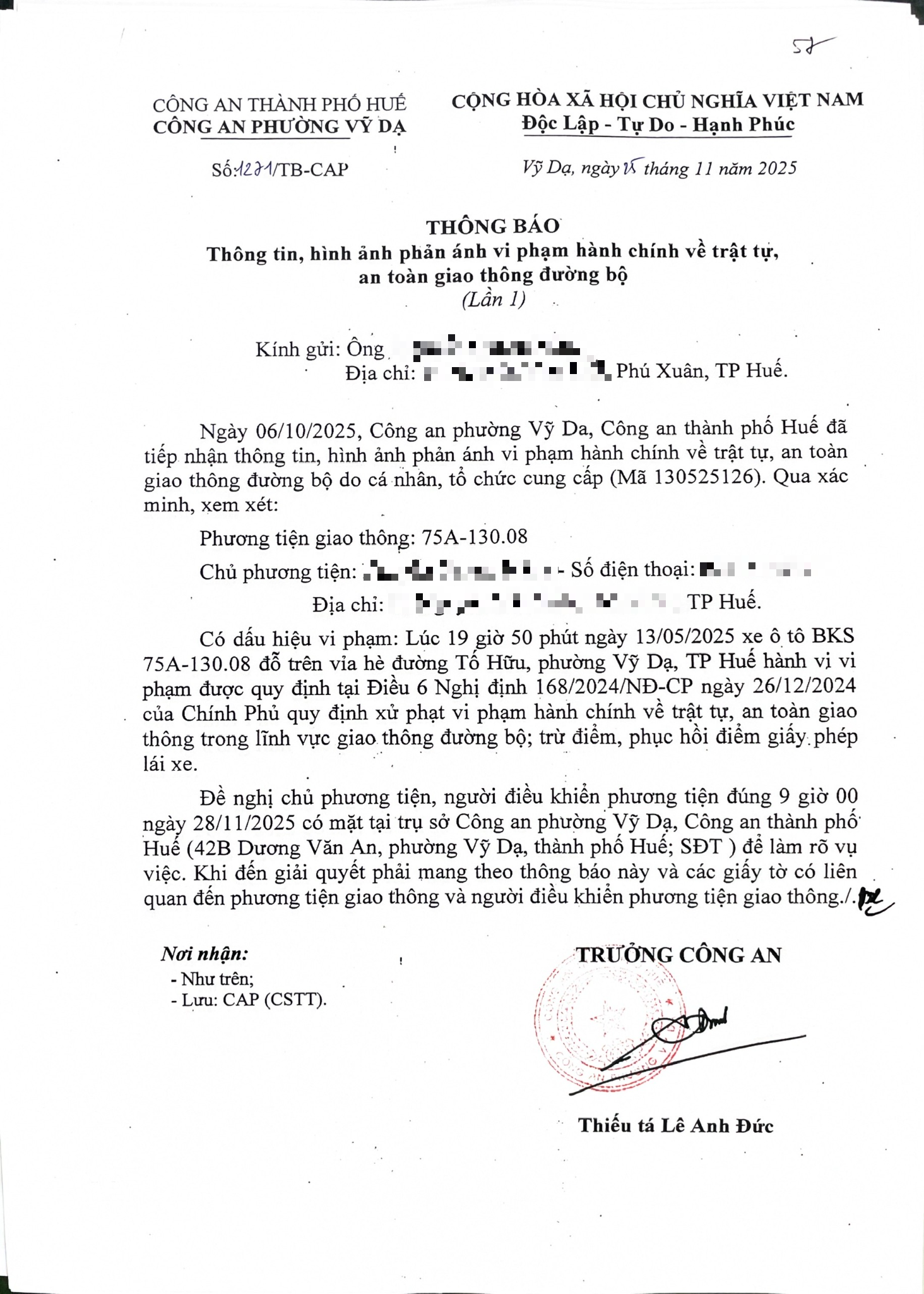 Công an phường Vỹ Dạ đã lập hồ sơ, thông báo chủ phương tiện đến làm việc. Tuy nhiên hiện chủ phương tiện vẫn chưa trình diện tại cơ quan. Công an phường Vỹ Dạ sẽ tiếp tục tăng cường thực hiện công tác tuần tra trên địa bàn, kịp thời phát hiện, xử lý các hành vi vi phạm theo quy định.