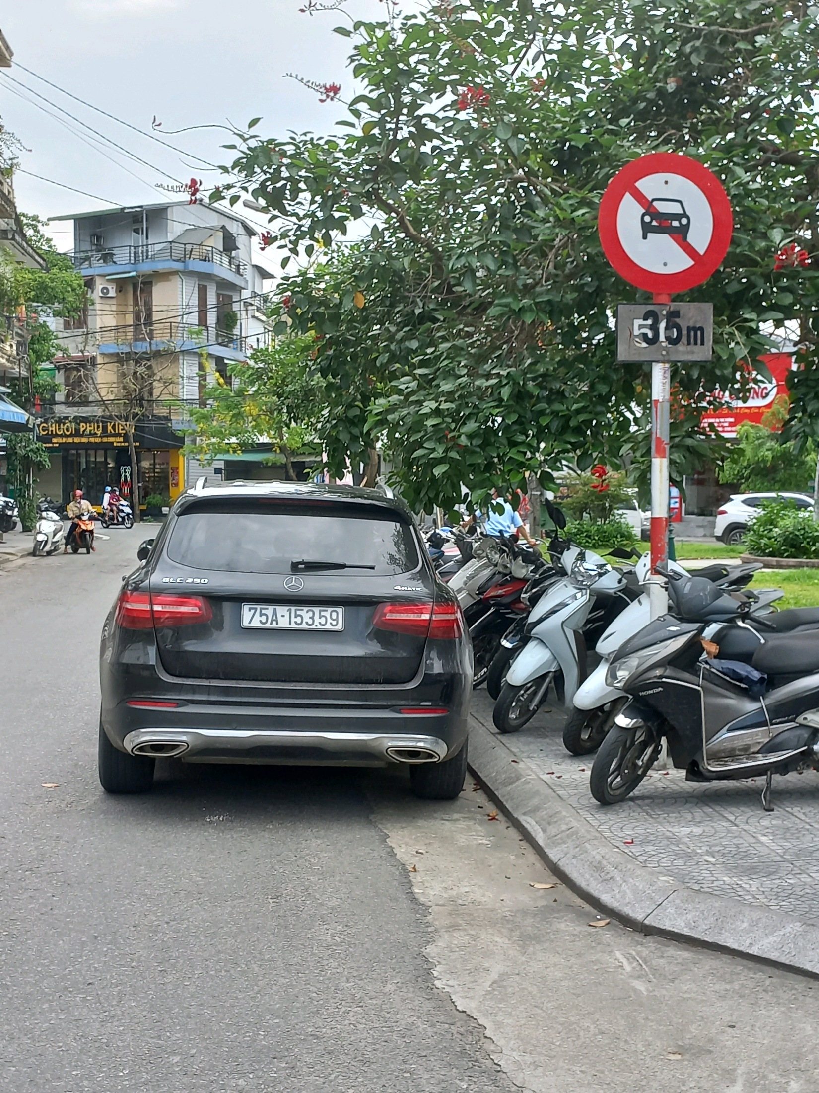 Qua khảo sát, đường Phan Bội Châu (theo hướng di chuyển được phản ánh) hiện nay bố trí biển báo cấm xe ô tô và biển phụ khoảng cách đến đối tượng báo hiệu là 35m (nghĩa là sau 35m hiệu lệnh cấm xe ô tô mới có hiệu lực). Đối chiếu với hình ảnh do Ông/Bà cung cấp, xe ô tô 75A15359 đang dừng đỗ ngay biển báo, do đó, xe ô tô 75A15359 không vi phạm quy định của pháp luật.