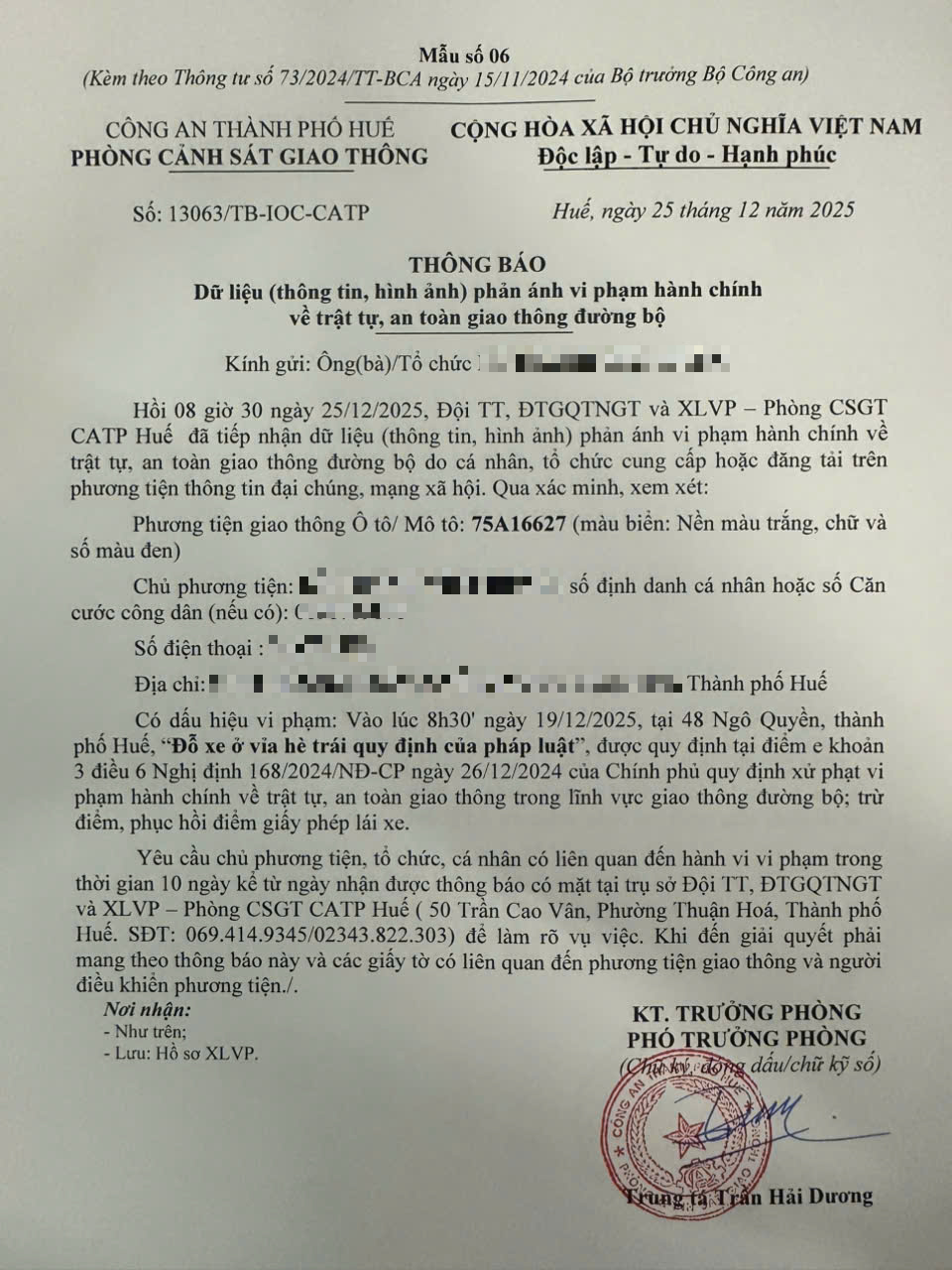 Qua hình ảnh phản ánh, Phòng Cảnh sát giao thông xác định lỗi vi phạm của người điều khiển phương tiện 75A16627 như sau: Đỗ xe ở vìa hè trái quy định của pháp luật, được quy định tại Điểm e khoản 3 Điều 6 Nghị định số 168/2024/NĐ-CP ngày 26/12/2024 của Chính phủ.