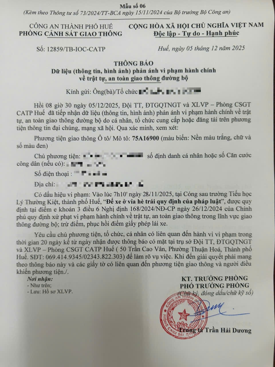 Qua hình ảnh phản ánh, Phòng Cảnh sát giao thông xác định lỗi vi phạm của người điều khiển phương tiện 75A16900 như sau: Đỗ xe ở vỉa hè trái quy định của pháp luật, quy định tại điểm e, khoản 3, điều 6 Nghị định 168/2024/NĐ-CP.