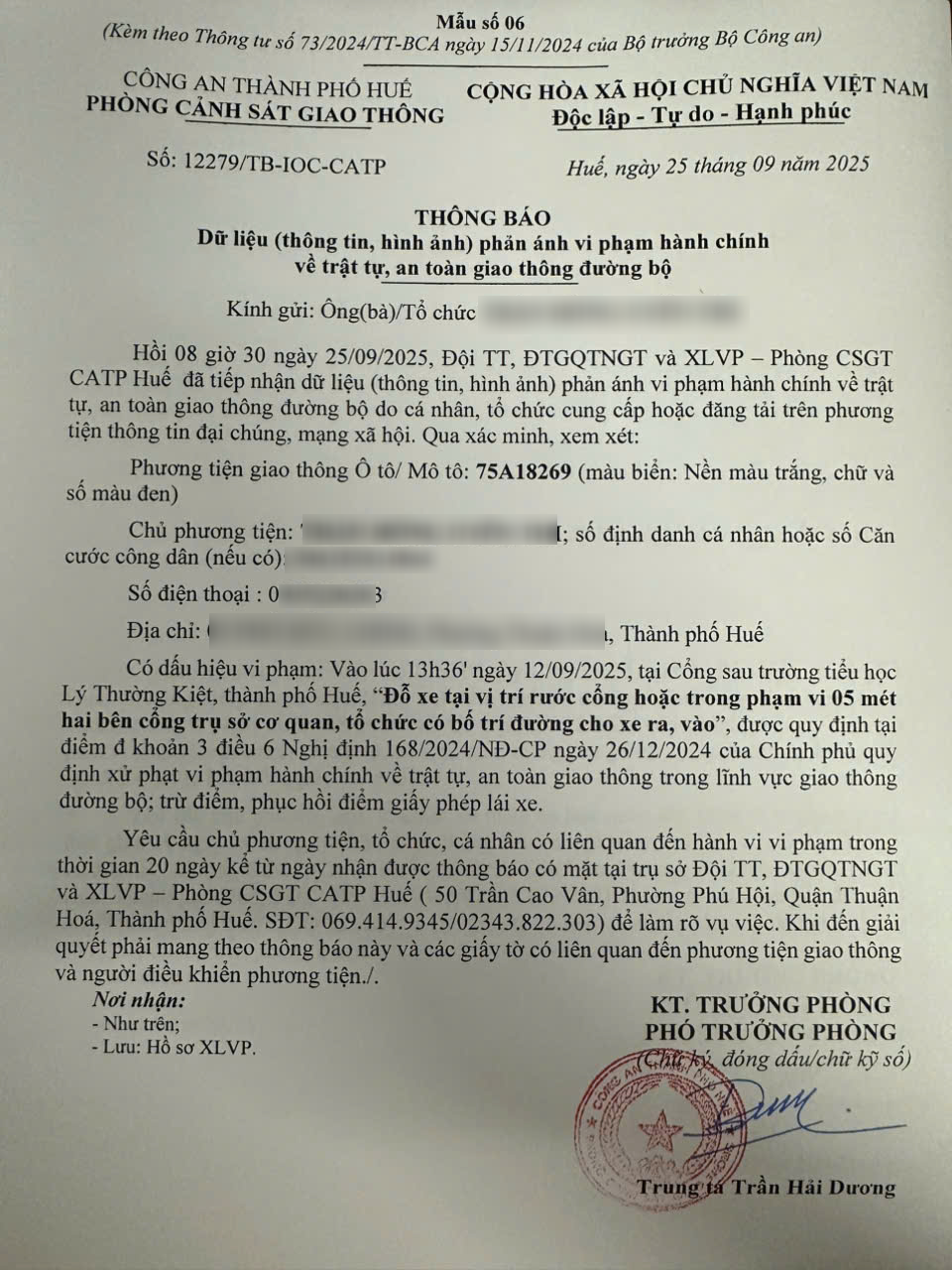 Qua hình ảnh phản ánh, người điều khiển phương tiện BKS 75A18269 có dấu hiệu vi phạm lỗi: “Dừng, đỗ xe tại vị trí trong phạm vi 05m hai bên cổng cơ quan, tổ chức có bố trí đường cho xe ô tô ra vào”, quy định tại điểm đ, khoản 3, điều 6 Nghị định số 168/2024/NĐ-CP ngày 26/12/2024 của Chính phủ quy định xử phạt vi phạm hành chính về trật tự, an toàn giao thông trong lĩnh vực giao thông đường bộ; trừ điểm, phục hồi điểm giấy phép lái xe.