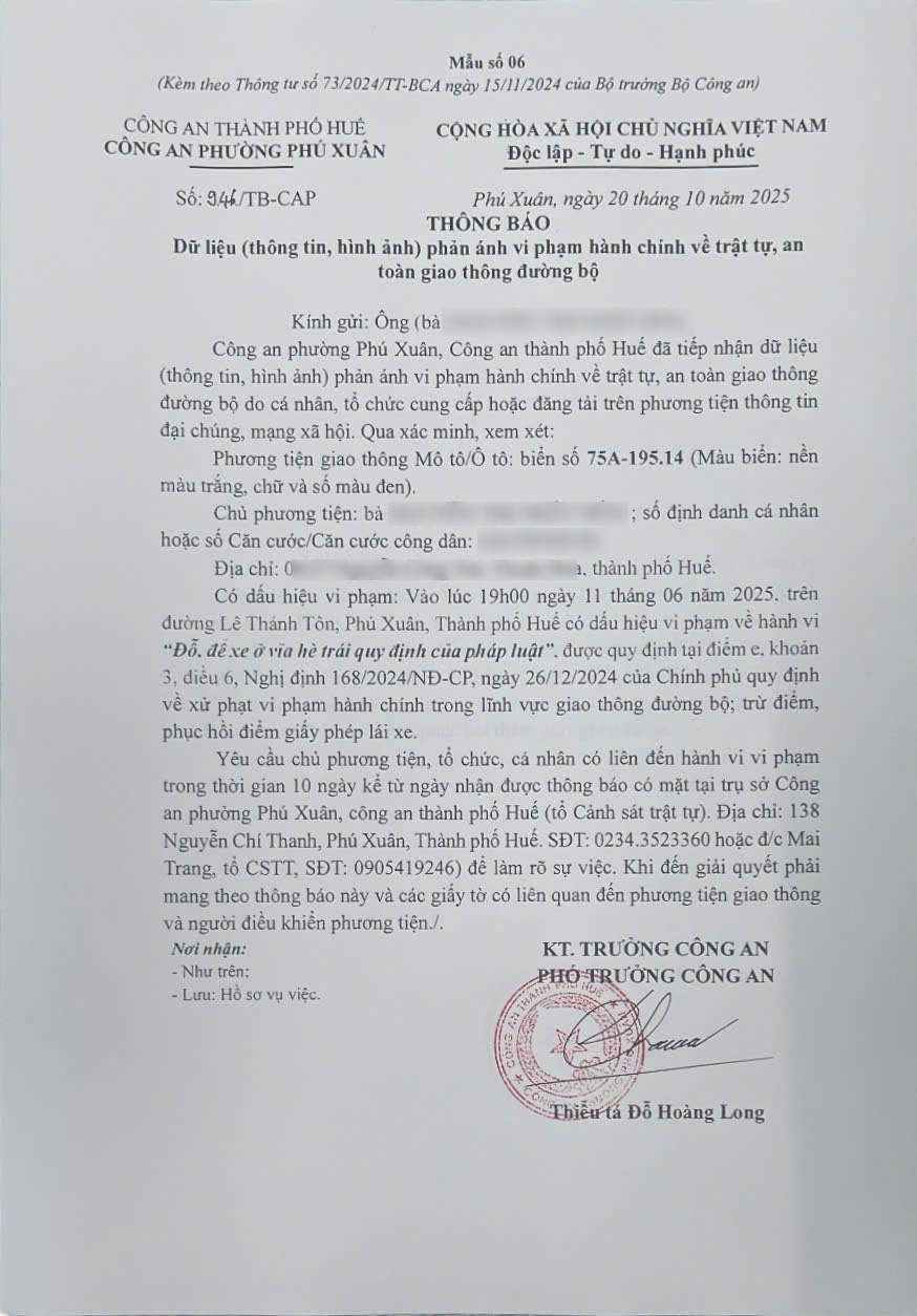 Công an phường Phú Xuân đã lập hồ sơ, thông báo chủ phương tiện đến làm việc. Tuy nhiên chủ phương tiện vẫn chưa đến trình diện tại cơ quan. Công an phường Phú Xuân sẽ gửi thông báo cho cơ quan đăng kiểm để đưa phương tiện vào cảnh báo trên Chương trình Quản lý kiểm định.