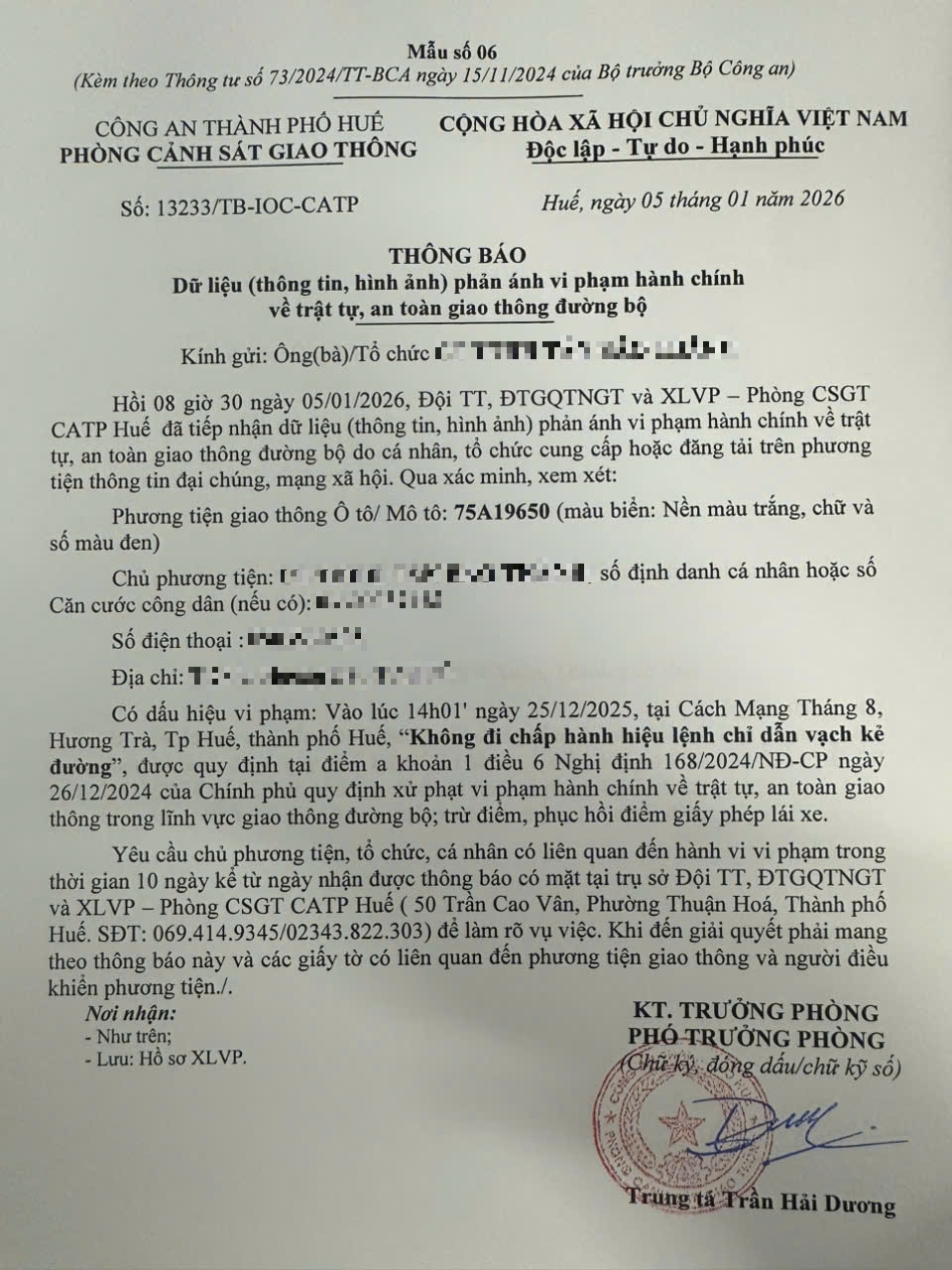 Qua hình ảnh phản ánh, Phòng Cảnh sát giao thông xác định lỗi vi phạm của người điều khiển phương tiện 75A19650 như sau: Không chấp hành hiệu lệnh, chỉ dẫn vạch kẻ đường, quy định tại điểm a, khoản 1, điều 6 Nghị định 168/2024/NĐ-CP.