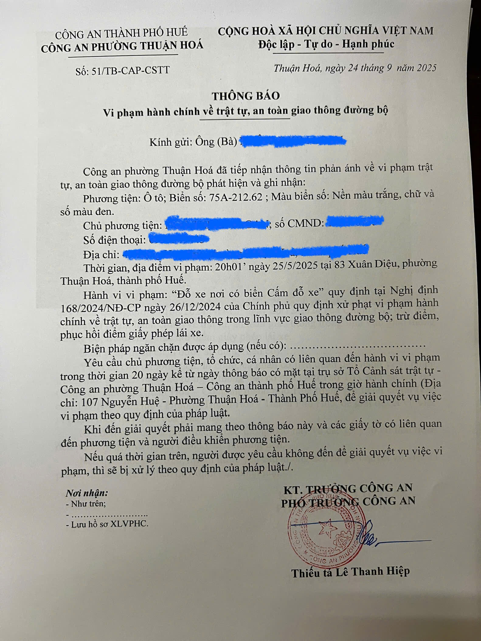 Công an phường Thuận Hóa đã lập hồ sơ, thông báo chủ phương tiện đến làm việc. Nếu quá ngày hẹn mà chủ phương tiện vẫn chưa đến trình diện tại cơ quan. Công an phường Thuận Hóa sẽ gửi thông báo cho cơ quan đăng kiểm để đưa phương tiện vào cảnh báo trên Chương trình Quản lý kiểm định.