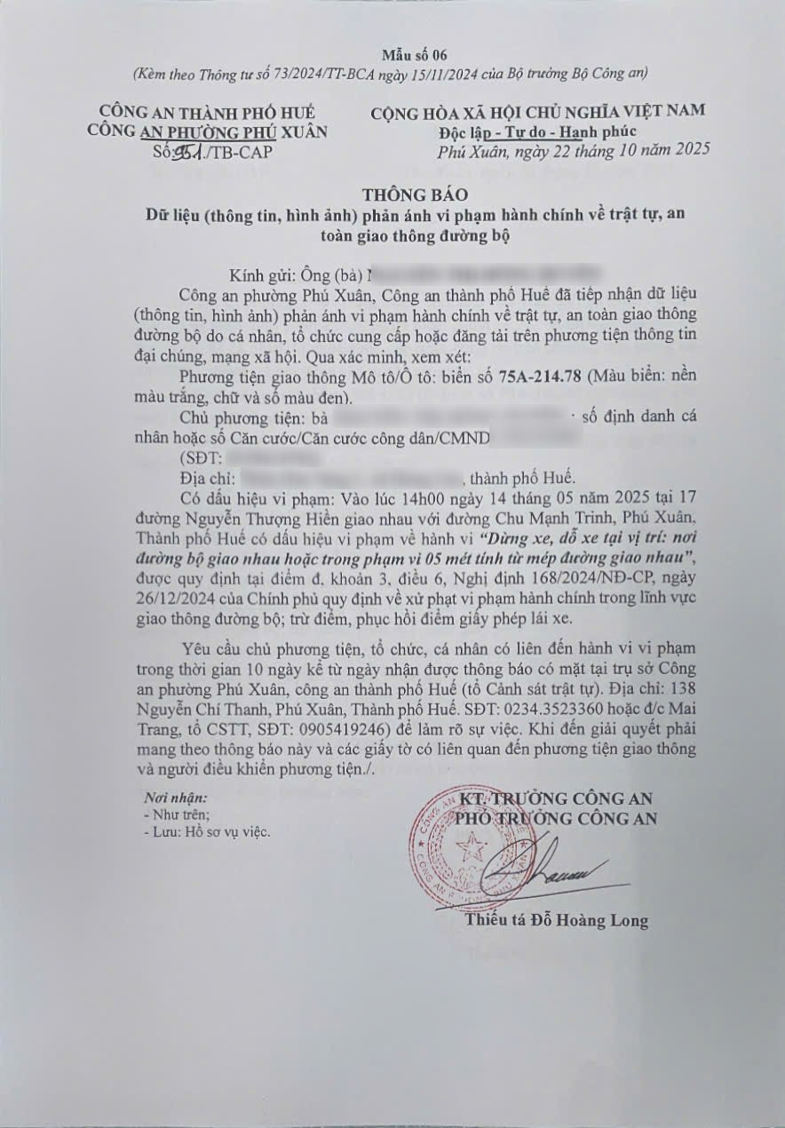 Công an phường Phú Xuân đã lập hồ sơ, thông báo chủ phương tiện đến làm việc. Tuy nhiên chủ phương tiện vẫn chưa đến trình diện tại cơ quan. Công an phường Phú Xuân sẽ gửi thông báo cho cơ quan đăng kiểm để đưa phương tiện vào cảnh báo trên Chương trình Quản lý kiểm định.