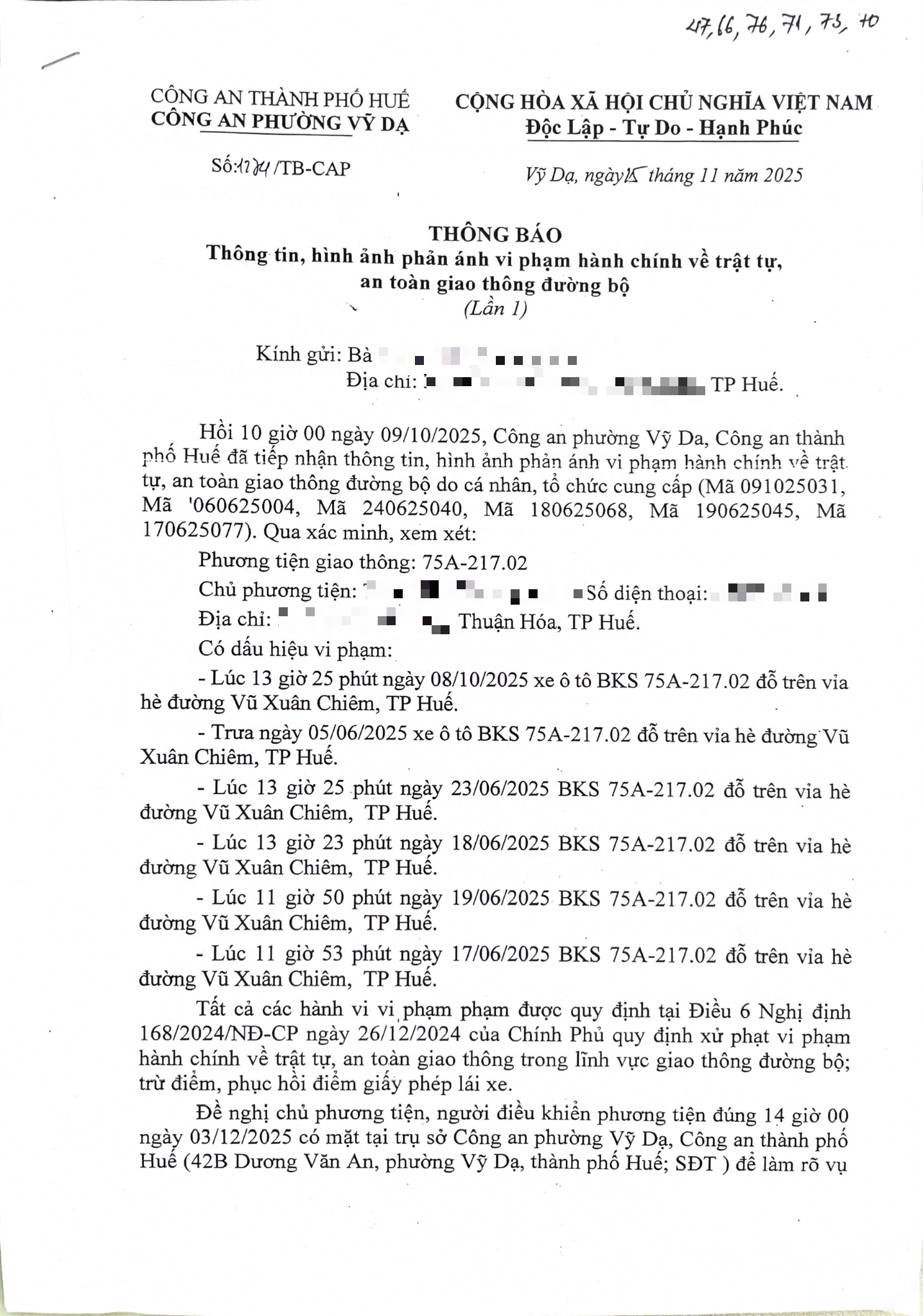 Công an phường Vỹ Dạ đã lập hồ sơ, thông báo chủ phương tiện đến làm việc. Tuy nhiên hiện chủ phương tiện vẫn chưa trình diện tại cơ quan. Công an phường Vỹ Dạ sẽ tiếp tục tăng cường thực hiện công tác tuần tra trên địa bàn, kịp thời phát hiện, xử lý các hành vi vi phạm theo quy định.
