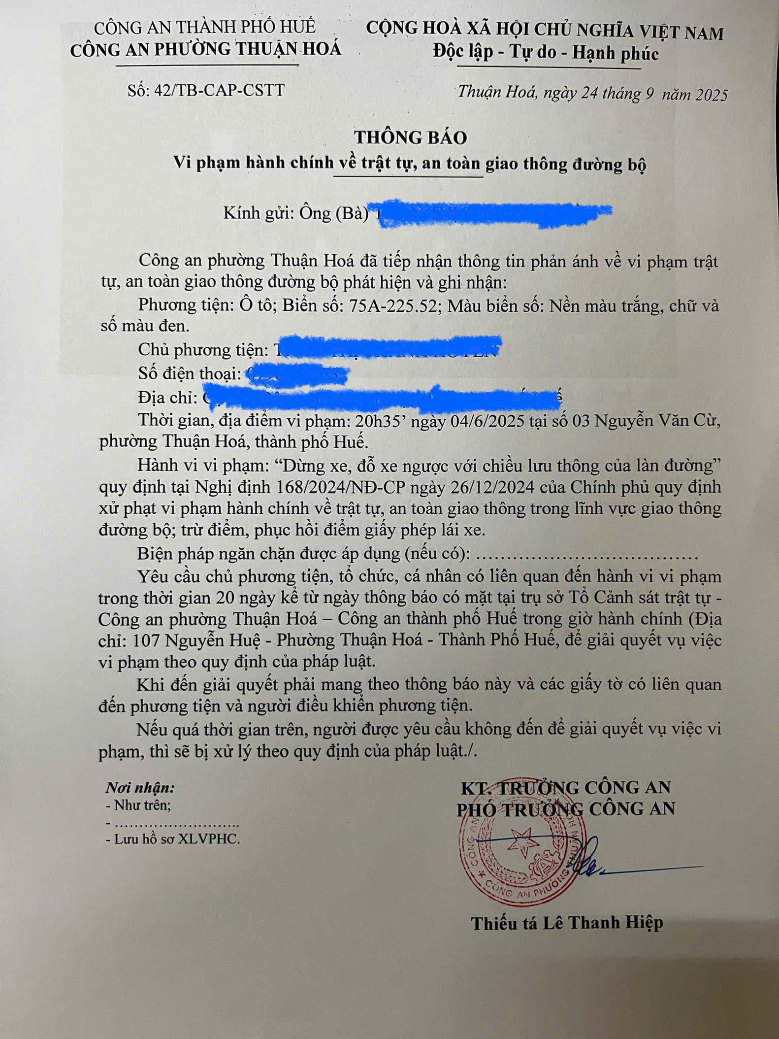 Công an phường Thuận Hóa đã lập hồ sơ, thông báo chủ phương tiện đến làm việc. Nếu quá ngày hẹn mà chủ phương tiện vẫn chưa đến trình diện tại cơ quan. Công an phường Thuận Hóa sẽ gửi thông báo cho cơ quan đăng kiểm để đưa phương tiện vào cảnh báo trên Chương trình Quản lý kiểm định.