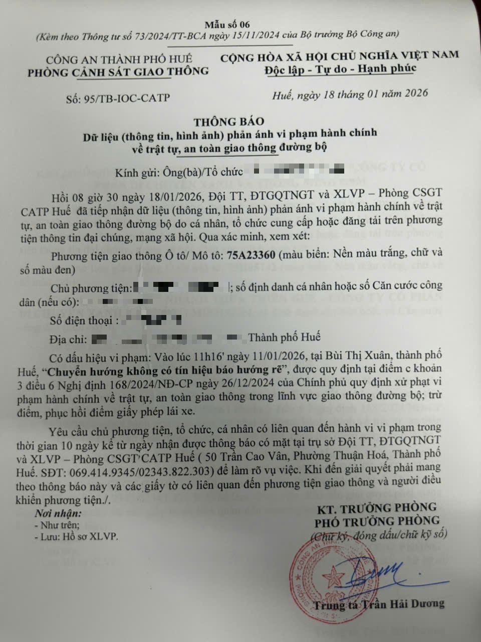 Qua hình ảnh phản ánh, Phòng Cảnh sát giao thông xác định lỗi vi phạm của người điều khiển phương tiện 75A23360 như sau: Chuyển hướng không có tín hiệu báo hướng rẽ, quy định tại điểm c, khoản 3, điều 6 Nghị định 168/2024/NĐ-CP.