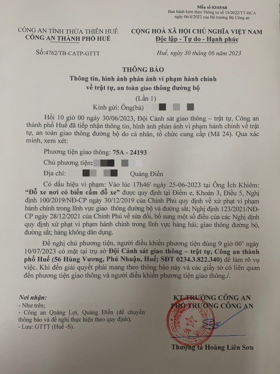 Vấn đề quý Ông/Bà phản ánh, Công an tỉnh đã chỉ đạo Công an thành phố Huế kiểm tra và xin thông báo kết quả xử lý như sau: