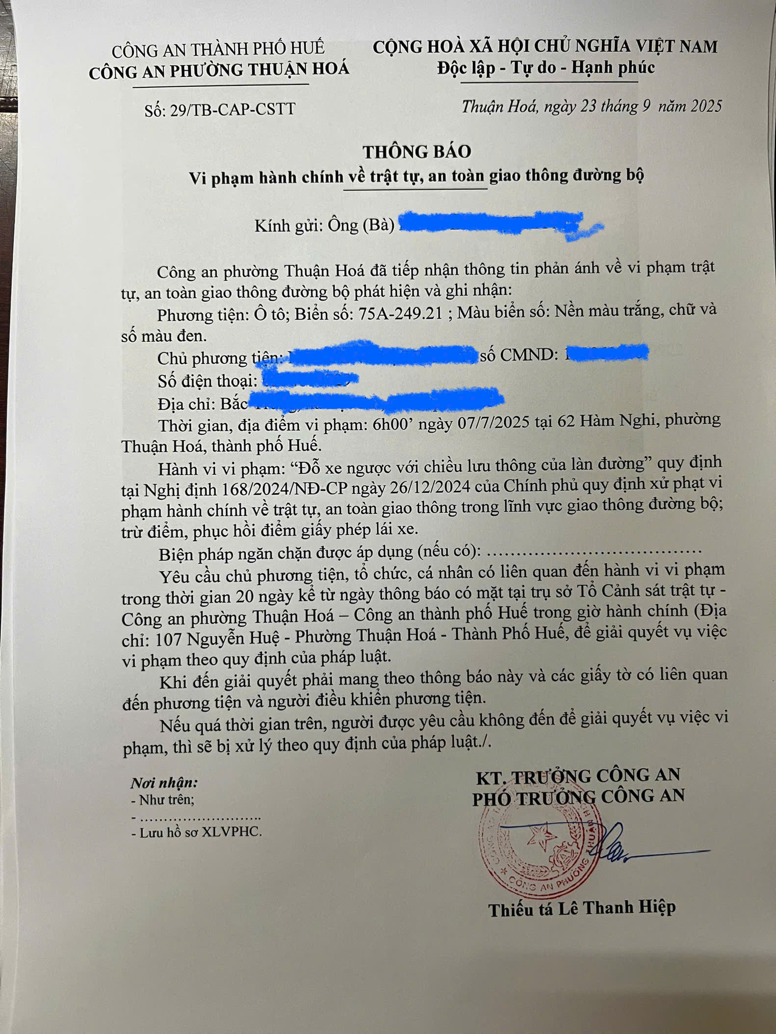 Công an phường Thuận Hóa đã lập hồ sơ, thông báo chủ phương tiện đến làm việc. Nếu quá ngày hẹn mà chủ phương tiện vẫn chưa đến trình diện tại cơ quan. Công an phường Thuận Hóa sẽ gửi thông báo cho cơ quan đăng kiểm để đưa phương tiện vào cảnh báo trên Chương trình Quản lý kiểm định.