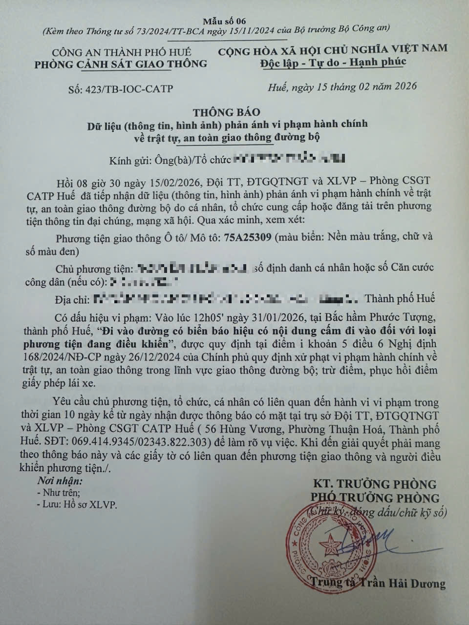 Qua hình ảnh phản ánh, Phòng Cảnh sát giao thông xác định lỗi vi phạm của người điều khiển phương tiện 75A25309 như sau: Đi vào đường có biển báo hiệu có nội dung cấm đi vào đối với loại phương tiện đang điều khiển, được quy định tại Điểm i khoản 5 Điều 6 Nghị định số 168/2024/NĐ-CP ngày 26/12/2024 của Chính phủ.