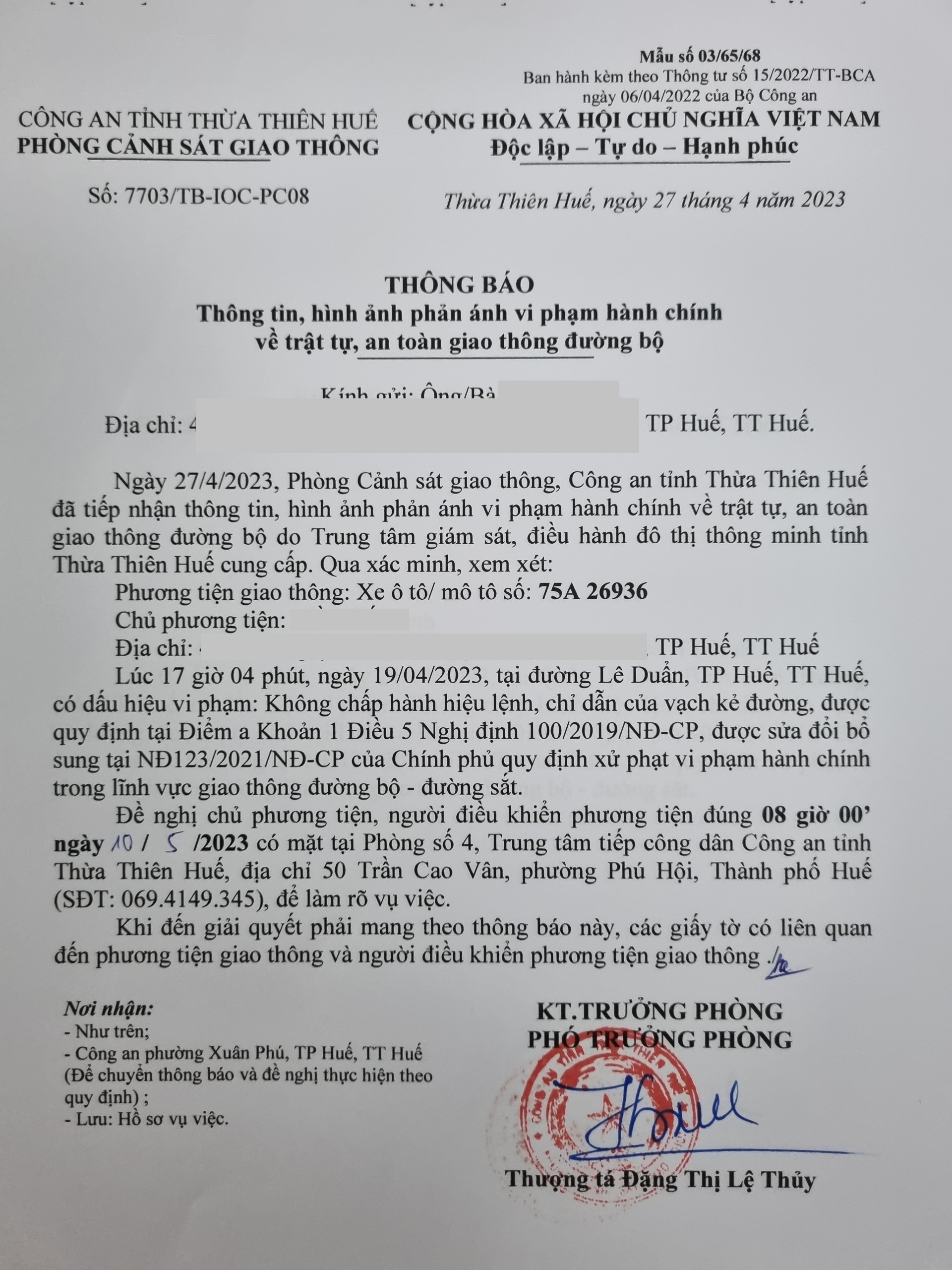 Phòng CSGT cập nhật kết quả: Qua xác minh làm việc với chủ phương tiện vi phạm lỗi: Không chấp hành hiệu lệnh, chỉ dẫn của vạch kẻ đường, quy định tại điểm a, khoản 1, điều 5 Nghị định 100/2019/NĐ-CP được sửa đổi, bổ sung tại Nghị định 123/NĐ-CP ngày 28/12/2021. Ra Quyết định xử phạt 350.000đ (Đính kèm Quyết định).