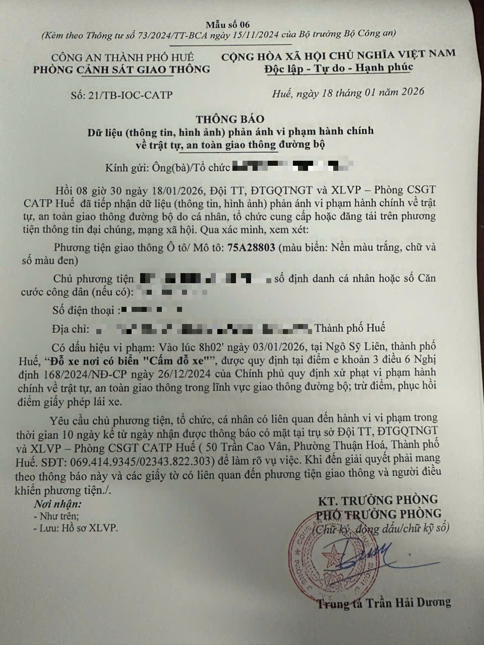 Qua hình ảnh phản ánh, Phòng Cảnh sát giao thông xác định lỗi vi phạm của người điều khiển phương tiện 75A28803 như sau: Đỗ xe nơi có biển "Cấm đỗ xe", quy định tại điểm e, khoản 3, điều 6 Nghị định 168/2024/NĐ-CP.