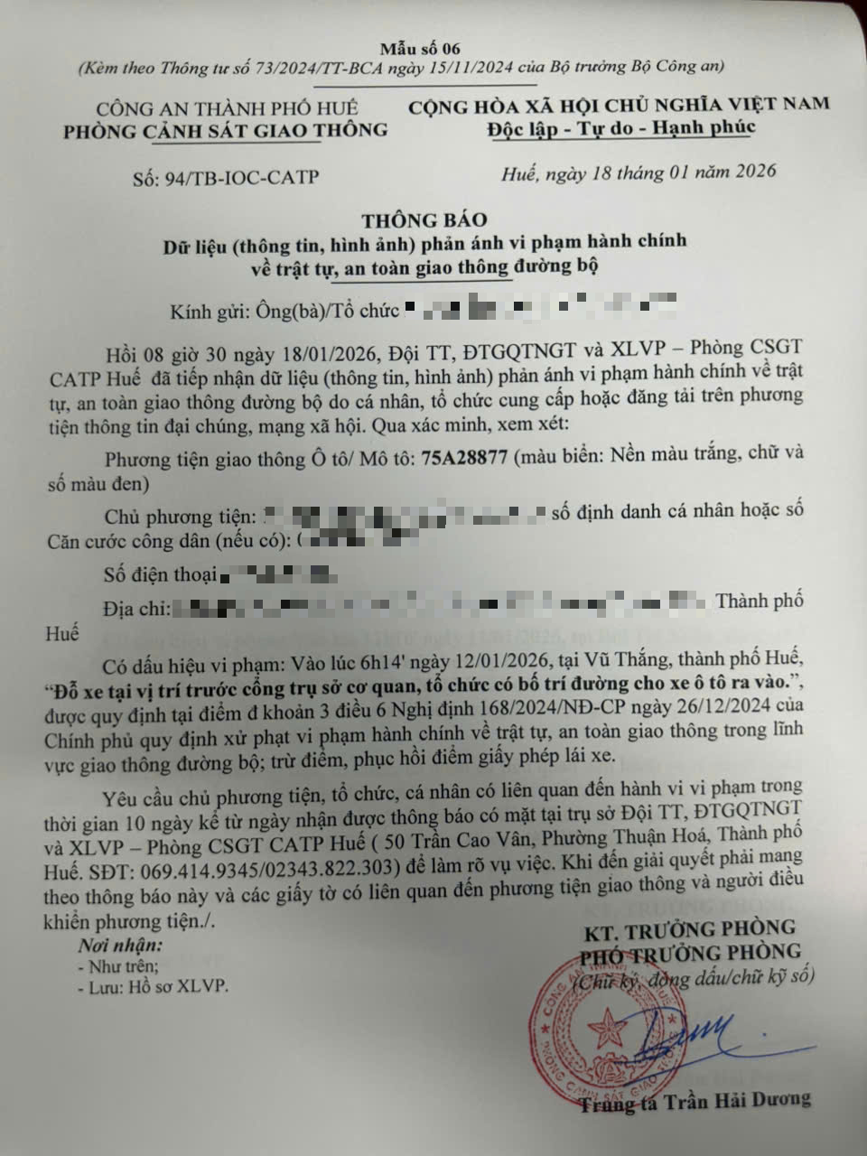 Qua hình ảnh phản ánh, Phòng Cảnh sát giao thông xác định lỗi vi phạm của người điều khiển phương tiện 75A28877 như sau: Đỗ xe tại vị trí trước hai bên cổng trụ sở cơ quan, tổ chức có bố trí đường cho xe ô tô ra vào, quy định tại điểm đ, khoản 3, điều 6 Nghị định 168/2024/NĐ-CP.