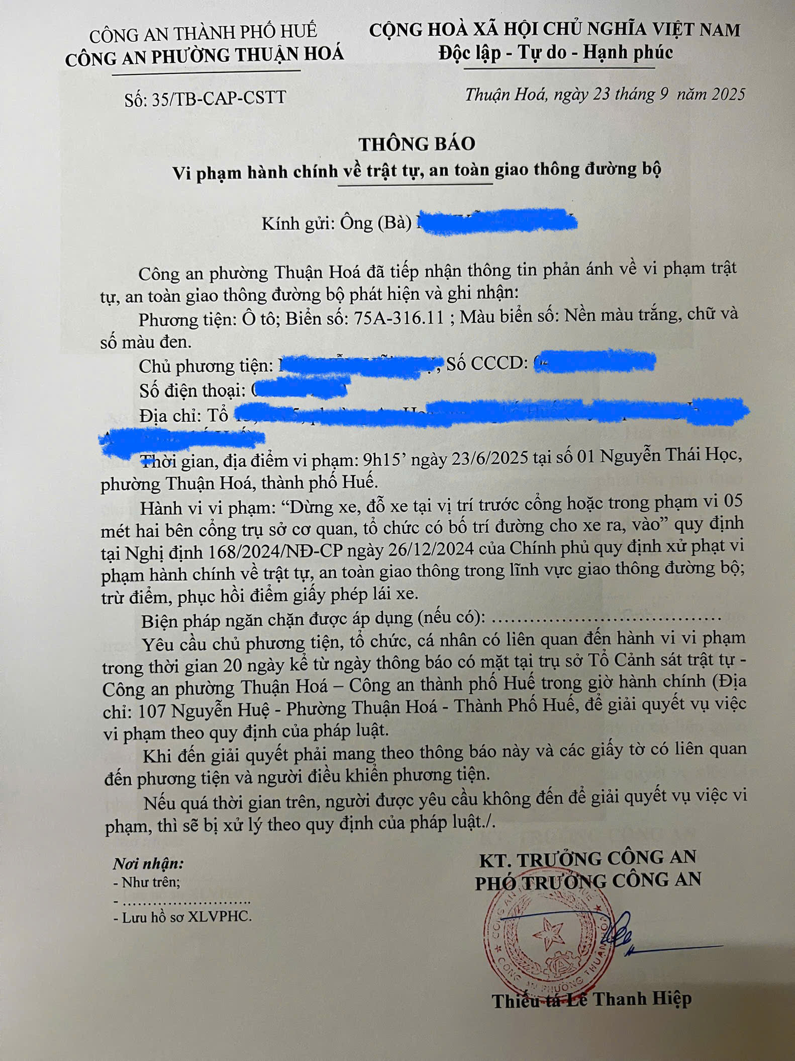 Công an phường Thuận Hóa đã lập hồ sơ, thông báo chủ phương tiện đến làm việc. Nếu quá ngày hẹn mà chủ phương tiện vẫn chưa đến trình diện tại cơ quan. Công an phường Thuận Hóa sẽ gửi thông báo cho cơ quan đăng kiểm để đưa phương tiện vào cảnh báo trên Chương trình Quản lý kiểm định.