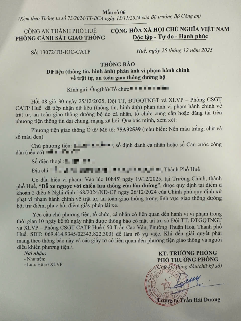 Qua hình ảnh phản ánh, Phòng Cảnh sát giao thông xác định lỗi vi phạm của người điều khiển phương tiện 75A32539 như sau: Đỗ xe ngược với chiều lưu thông của làn đường, được quy định tại Điểm đ khoản 2 Điều 6 Nghị định số 168/2024/NĐ-CP ngày 26/12/2024 của Chính phủ.