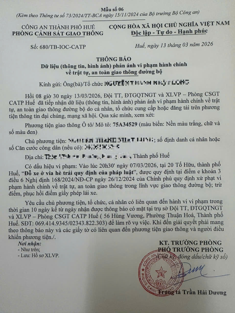Qua hình ảnh phản ánh, người điều khiển phương tiện BKS 75A34529 có dấu hiệu vi phạm lỗi: “Đỗ xe ở vỉa hè trái quy định của pháp luật”, quy định tại điểm e, khoản 3, điều 6 Nghị định số 168/2024/NĐ-CP ngày 26/12/2024 của Chính phủ quy định xử phạt vi phạm hành chính về trật tự, an toàn giao thông trong lĩnh vực giao thông đường bộ; trừ điểm, phục hồi điểm giấy phép lái xe.