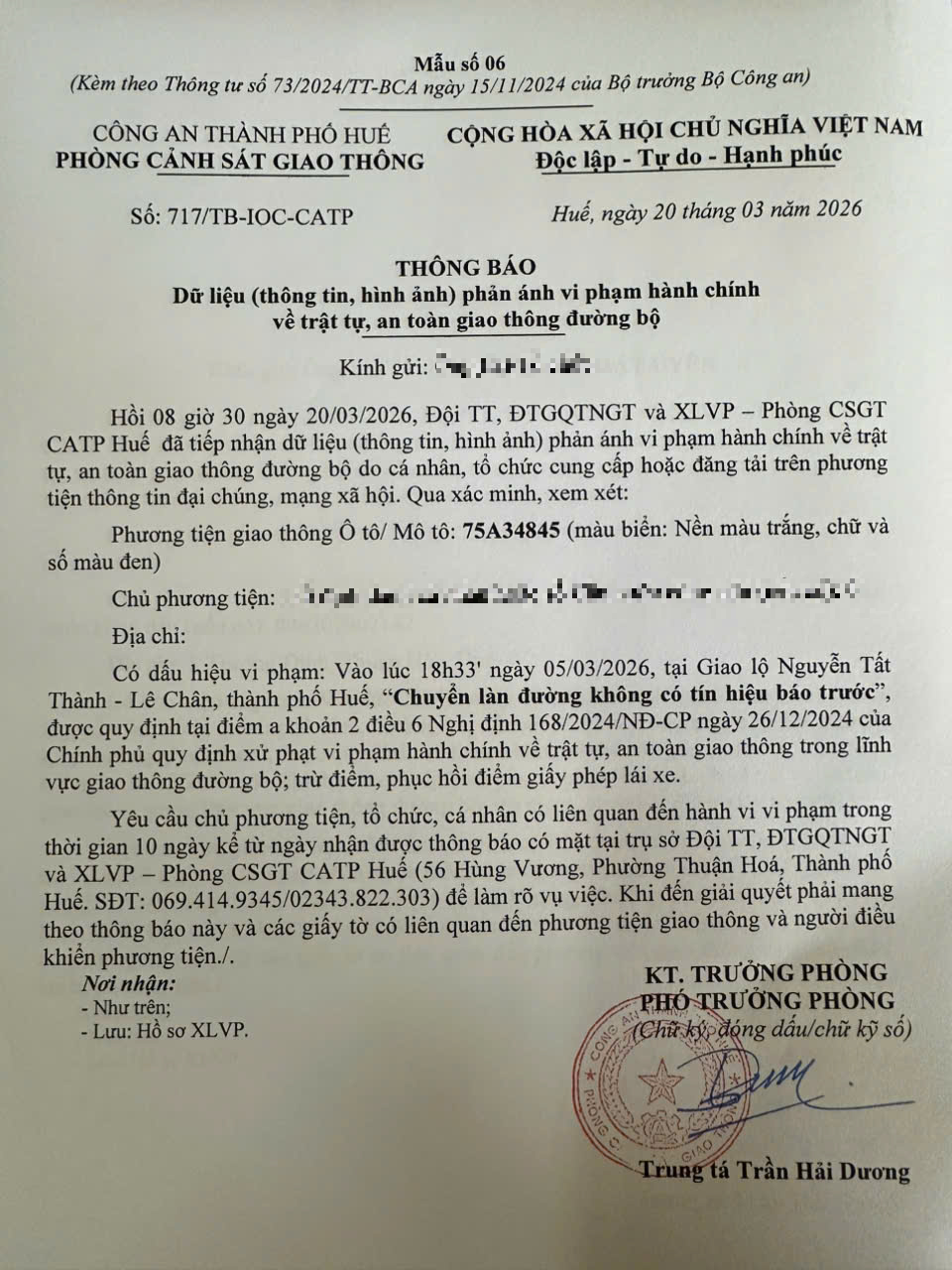 Vấn đề quý Ông/Bà phản ánh, Công an thành phố Huế đã chỉ đạo Phòng Cảnh sát giao thông kiểm tra và xin thông báo kết quả như sau: