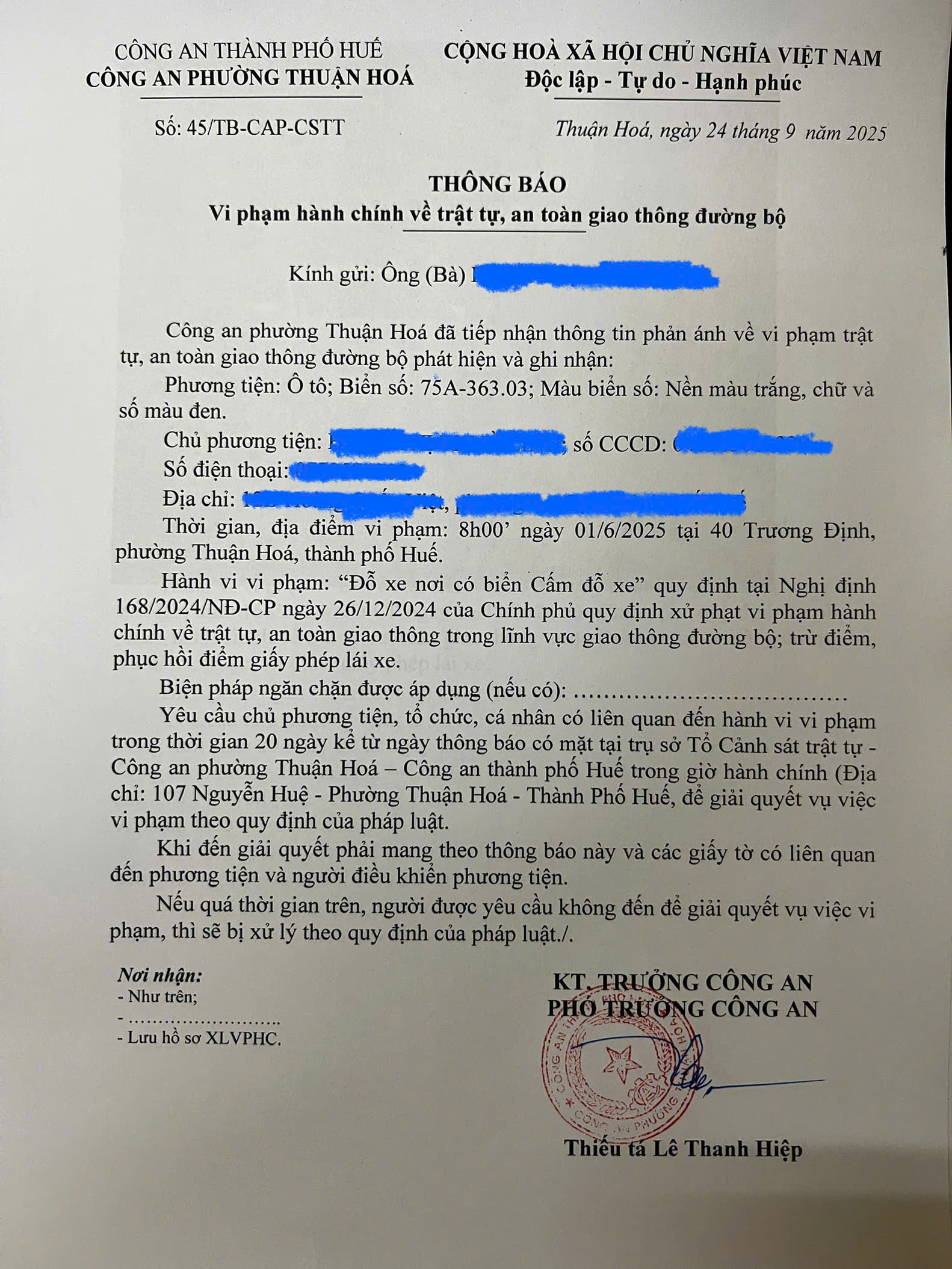 Công an phường Thuận Hóa đã lập hồ sơ, thông báo chủ phương tiện đến làm việc. Nếu quá ngày hẹn mà chủ phương tiện vẫn chưa đến trình diện tại cơ quan. Công an phường Thuận Hóa sẽ gửi thông báo cho cơ quan đăng kiểm để đưa phương tiện vào cảnh báo trên Chương trình Quản lý kiểm định.