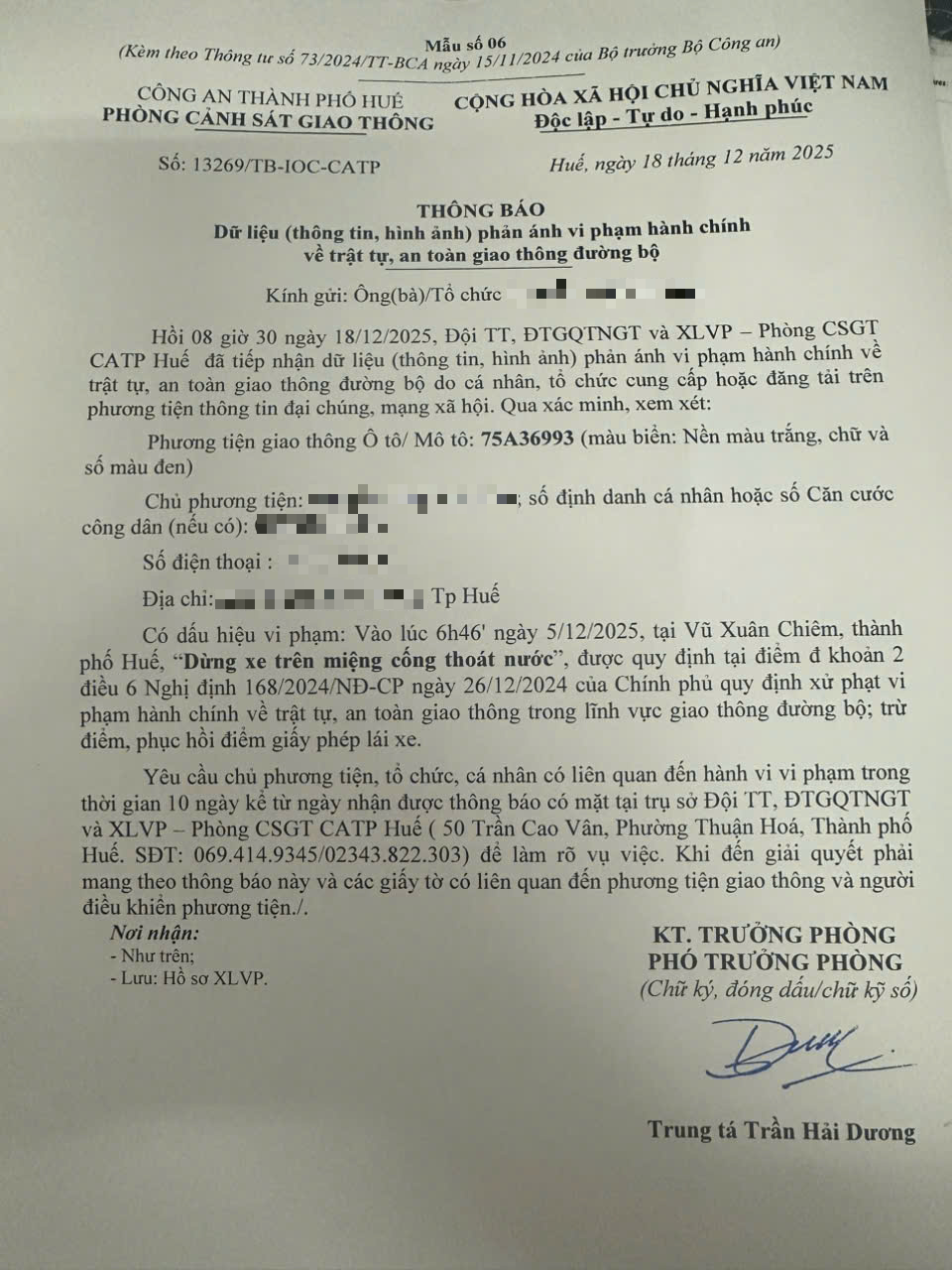 Qua hình ảnh phản ánh, người điều khiển phương tiện BKS 75A36993 có dấu hiệu vi phạm lỗi: Dừng xe trên miệng cống thoát nước, quy định tại điểm đ, khoản 2, điều 6 Nghị định số 168/2024/NĐ-CP ngày 26/12/2024 của Chính phủ quy định xử phạt vi phạm hành chính về trật tự, an toàn giao thông trong lĩnh vực giao thông đường bộ; trừ điểm, phục hồi điểm giấy phép lái xe.