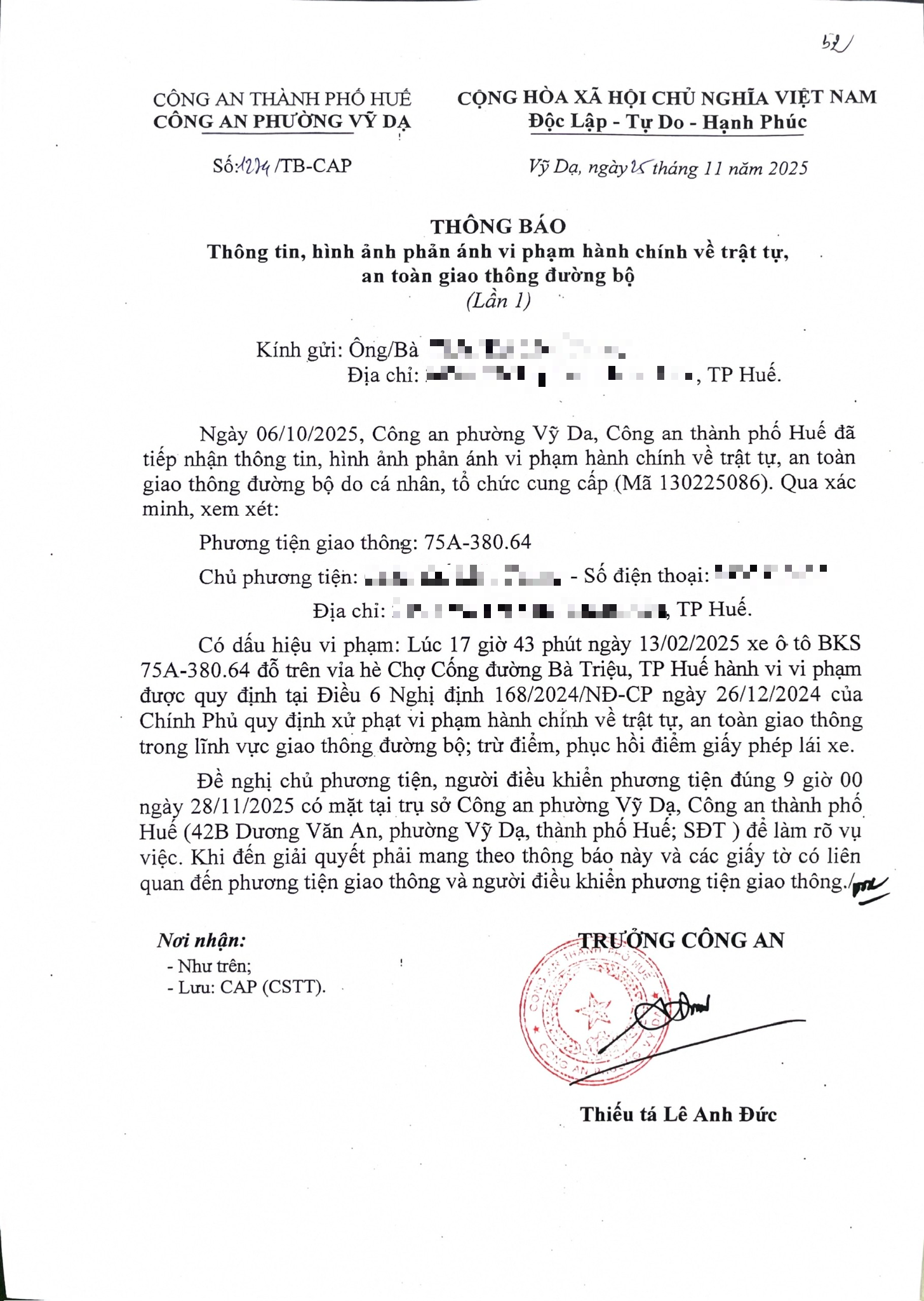 Công an phường Vỹ Dạ đã lập hồ sơ, thông báo chủ phương tiện đến làm việc. Tuy nhiên hiện chủ phương tiện vẫn chưa trình diện tại cơ quan. Công an phường Vỹ Dạ sẽ tiếp tục tăng cường thực hiện công tác tuần tra trên địa bàn, kịp thời phát hiện, xử lý các hành vi vi phạm theo quy định.