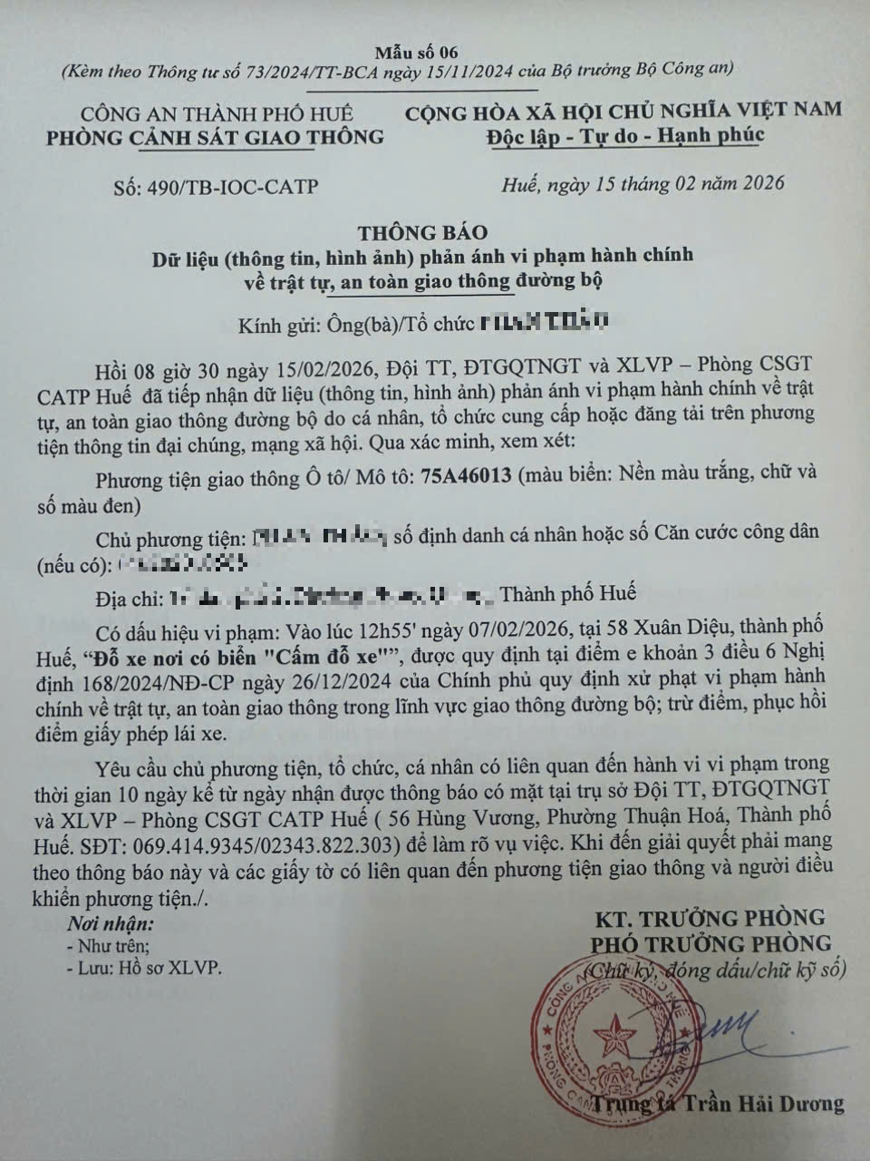 Qua hình ảnh phản ánh, Phòng Cảnh sát giao thông xác định lỗi vi phạm của người điều khiển phương tiện 75A46013 như sau: “Đỗ xe nơi có biển "Cấm đỗ xe"”, quy định tại điểm e, khoản 3, điều 6 Nghị định 168/2024/NĐ-CP.