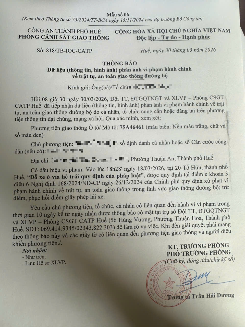 Qua hình ảnh phản ánh, Phòng Cảnh sát giao thông xác định lỗi vi phạm của người điều khiển phương tiện 75A46461 như sau: “Đỗ xe ở vìa hè trái quy định của pháp luật”, quy định tại điểm e, khoản 3, điều 6 Nghị định 168/2024/NĐ-CP.