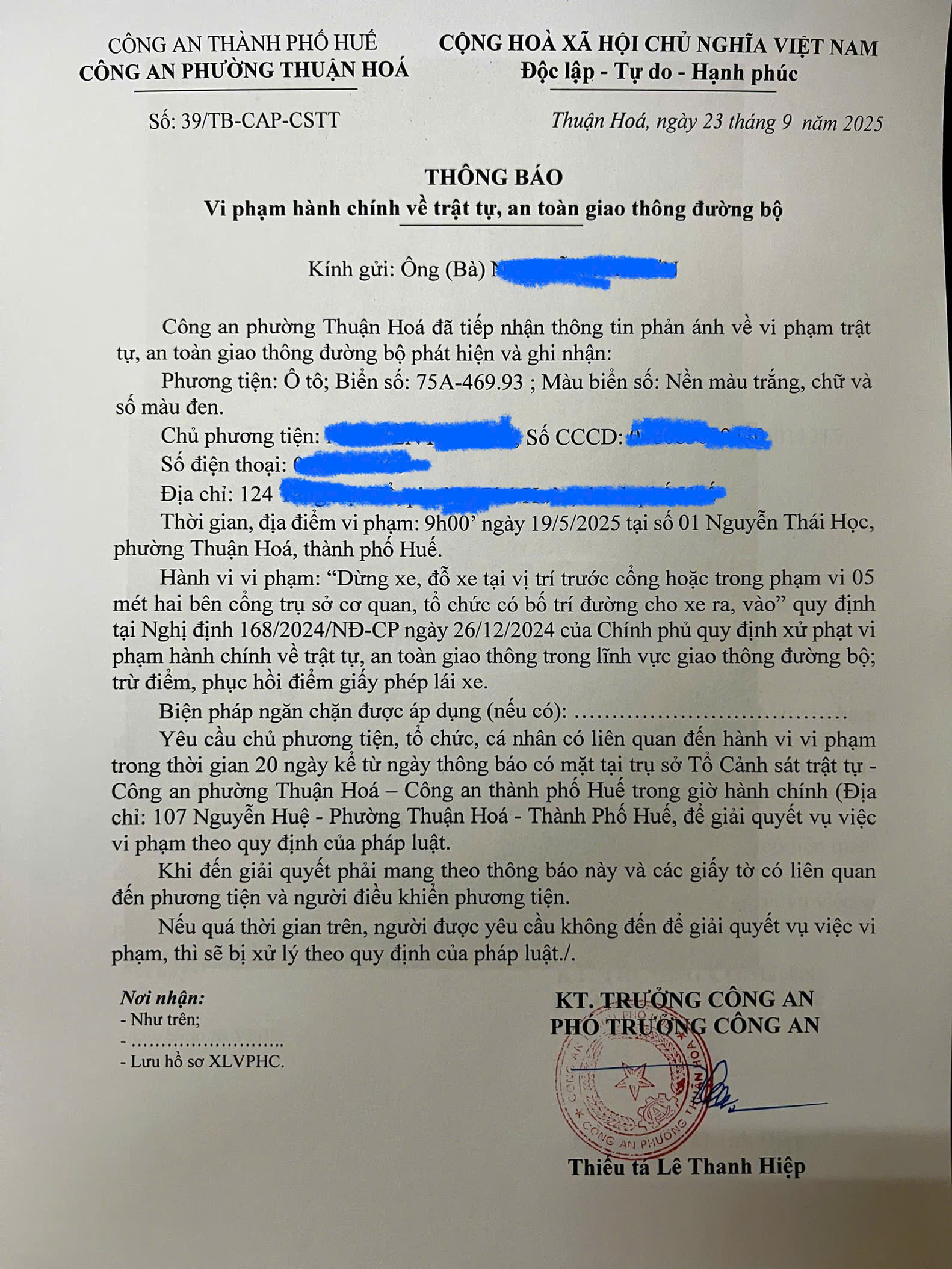Công an phường Thuận Hóa đã lập hồ sơ, thông báo chủ phương tiện đến làm việc. Nếu quá ngày hẹn mà chủ phương tiện vẫn chưa đến trình diện tại cơ quan. Công an phường Thuận Hóa sẽ gửi thông báo cho cơ quan đăng kiểm để đưa phương tiện vào cảnh báo trên Chương trình Quản lý kiểm định.