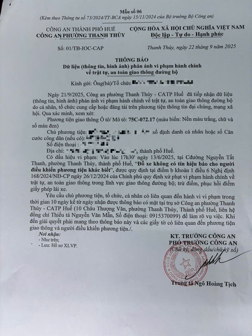 Công an phường Thanh Thuỷ đã thông báo chủ xe vi phạm có mặt tại trụ sở Công an phường Thanh Thuỷ, thành phố Huế số 10 đường Châu Thượng Văn, phường Thanh Thuỷ để làm rõ vụ việc trong vòng 10 ngày. Sau khi Công an phường Thanh Thuỷ làm việc với chủ xe sẽ trả lời thông tin cho quý Ông/Bà phản ánh được rõ.