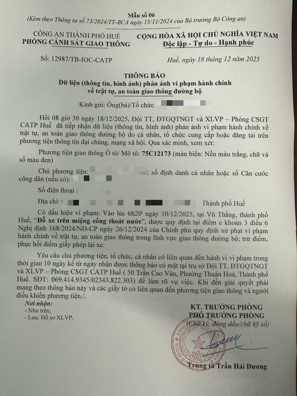 Qua hình ảnh phản ánh, Phòng Cảnh sát giao thông xác định lỗi vi phạm của người điều khiển phương tiện 75C12173 như sau: Đỗ xe trên miệng cống thoát nước, được quy định tại Điểm e khoản 3 Điều 6 Nghị định số 168/2024/NĐ-CP ngày 26/12/2024 của Chính phủ.