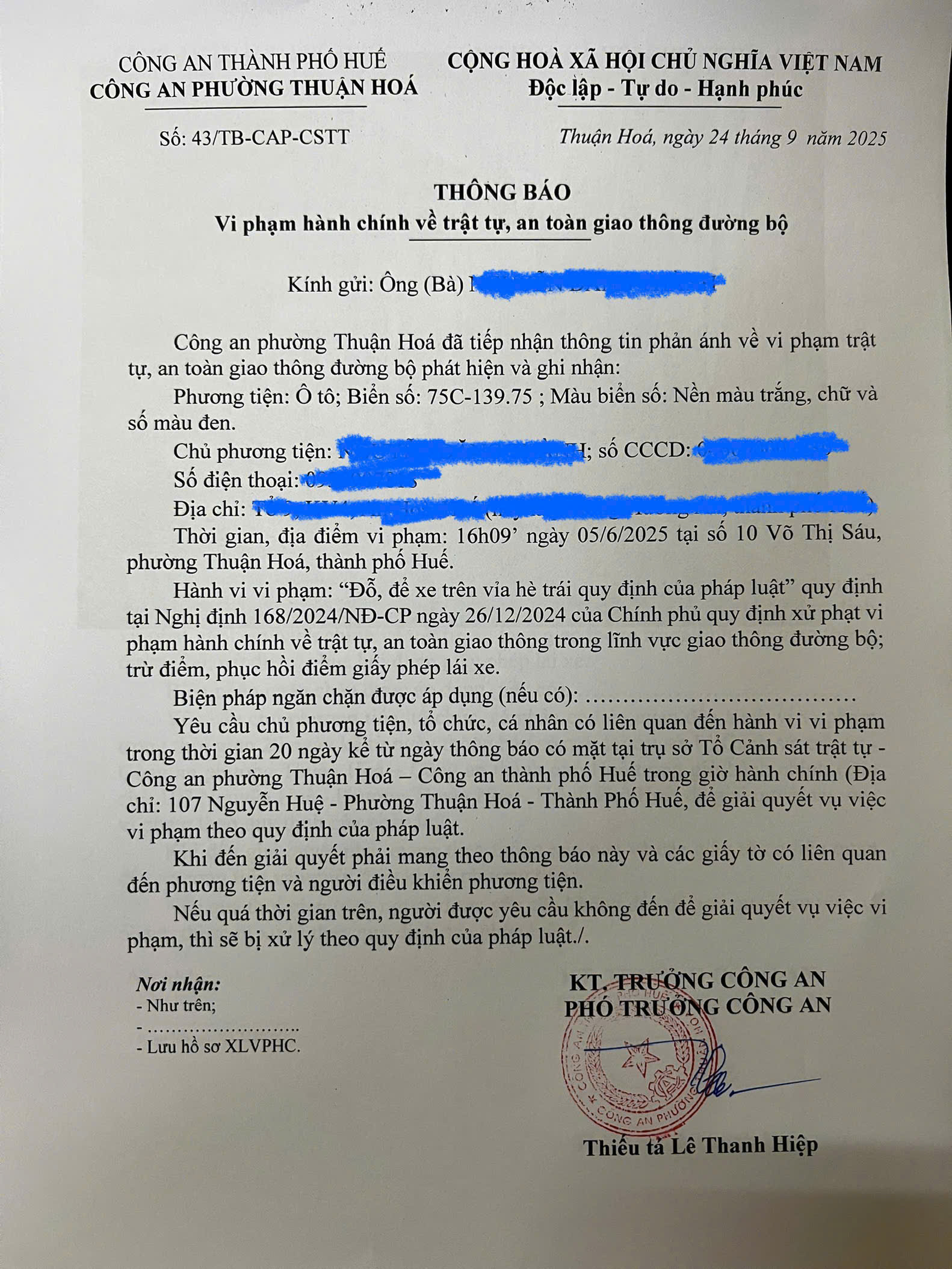 Công an phường Thuận Hóa đã lập hồ sơ, thông báo chủ phương tiện đến làm việc. Nếu quá ngày hẹn mà chủ phương tiện vẫn chưa đến trình diện tại cơ quan. Công an phường Thuận Hóa sẽ gửi thông báo cho cơ quan đăng kiểm để đưa phương tiện vào cảnh báo trên Chương trình Quản lý kiểm định.