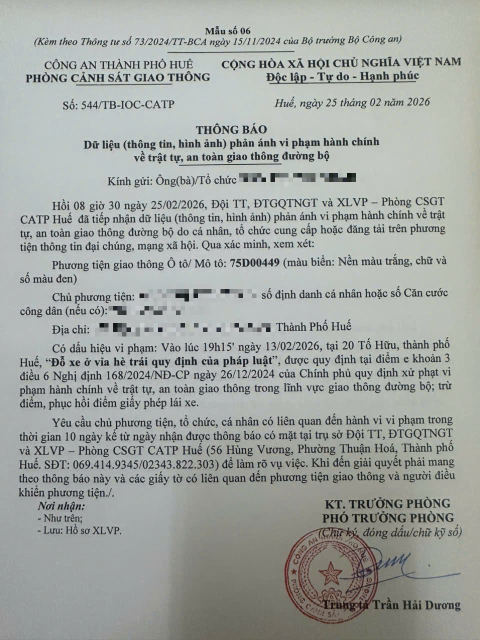 Qua hình ảnh phản ánh, Phòng Cảnh sát giao thông xác định lỗi vi phạm của người điều khiển phương tiện 75D00449 như sau: “Đỗ xe ở vỉa hè trái quy định của pháp luật”, quy định tại điểm e, khoản 3, điều 6 Nghị định 168/2024/NĐ-CP.