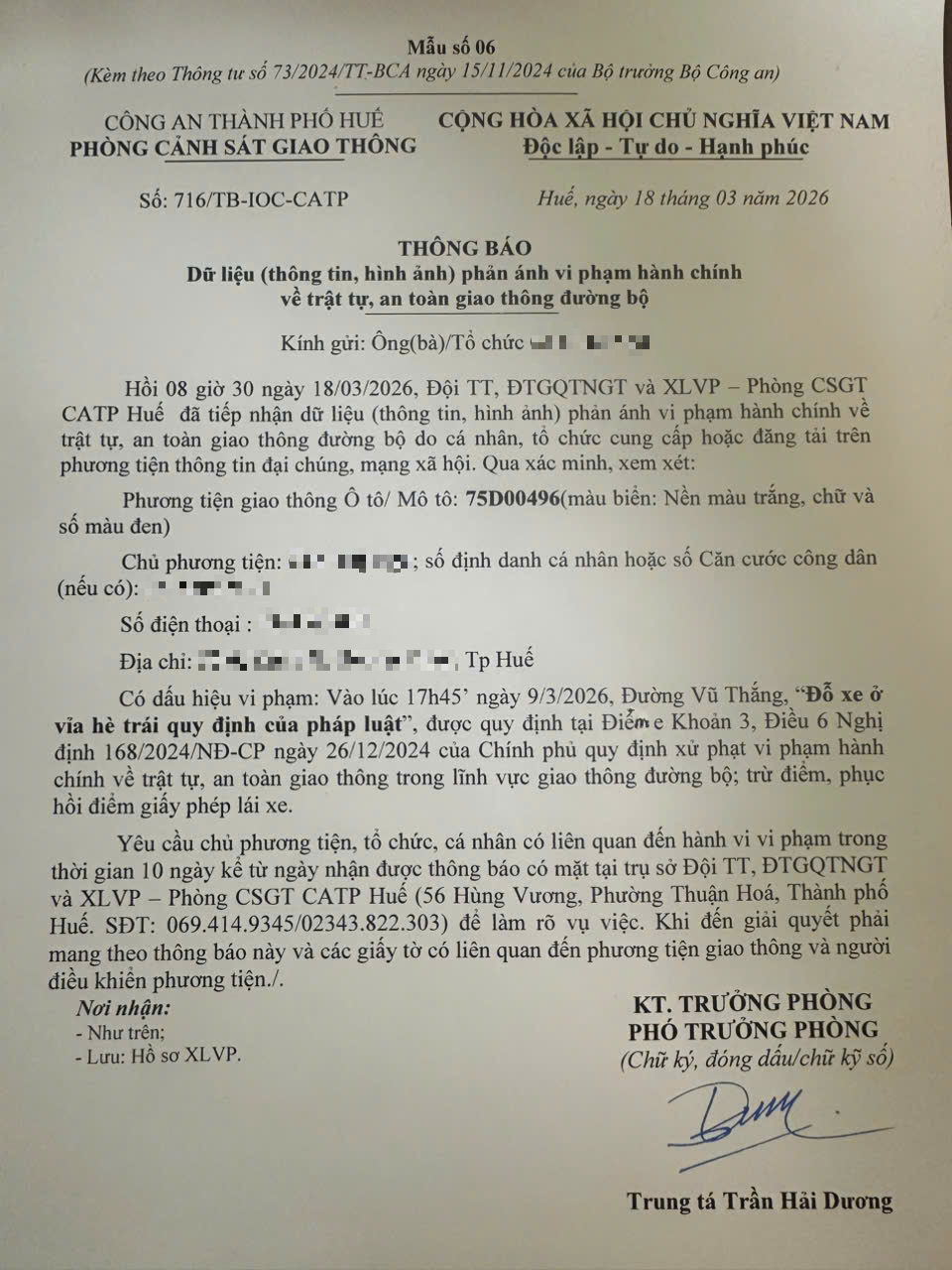Qua hình ảnh phản ánh, Phòng Cảnh sát giao thông xác định lỗi vi phạm của người điều khiển phương tiện 75D00496 như sau: “Đỗ xe ở vỉa hè trái quy định của pháp luật”, quy định tại điểm e, khoản 3, điều 6 Nghị định 168/2024/NĐ-CP.