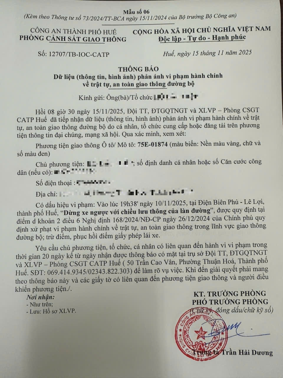 Vấn đề quý Ông/Bà phản ánh, Phòng Cảnh sát giao thông – Công an thành phố Huế đã kiểm tra và xin thông báo kết quả như sau: