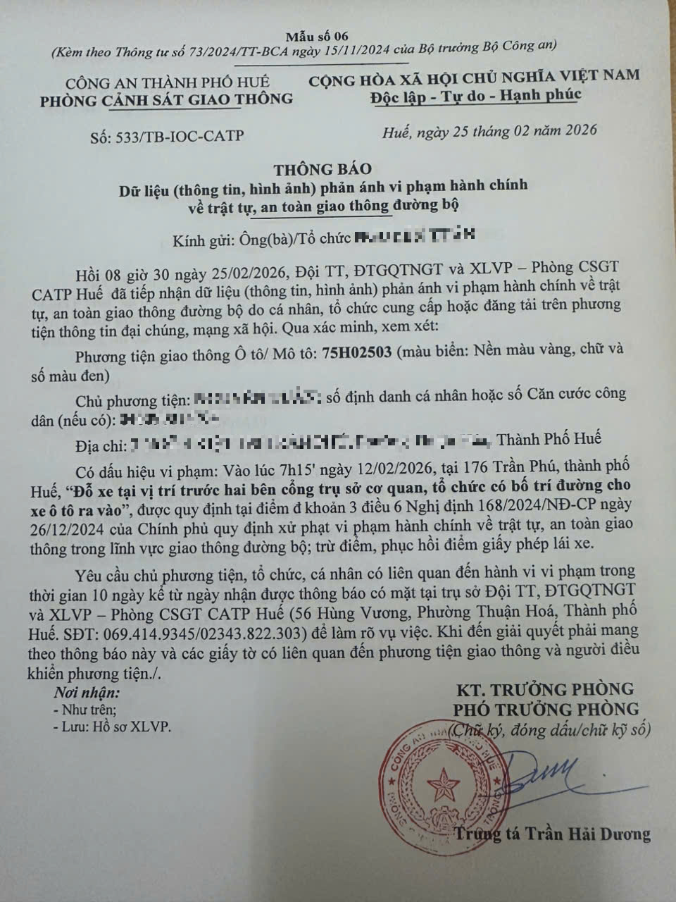 Từ hình ảnh/video được cung cấp, người điều khiển phương tiện 75H02503 có dấu hiệu vi phạm lỗi: “Đỗ xe tại vị trí trước hai bên cổng trụ sở cơ quan, tổ chức có bố trí đường cho xe ô tô ra vào”, quy định tại điểm đ, khoản 3, điều 6 Nghị định 168/2024/NĐ-CP ngày 26/12/2024 của Chính phủ quy định xử phạt vi phạm hành chính về trật tự, an toàn giao thông trong lĩnh vực giao thông đường bộ; trừ điểm, phục hồi điểm giấy phép lái xe.