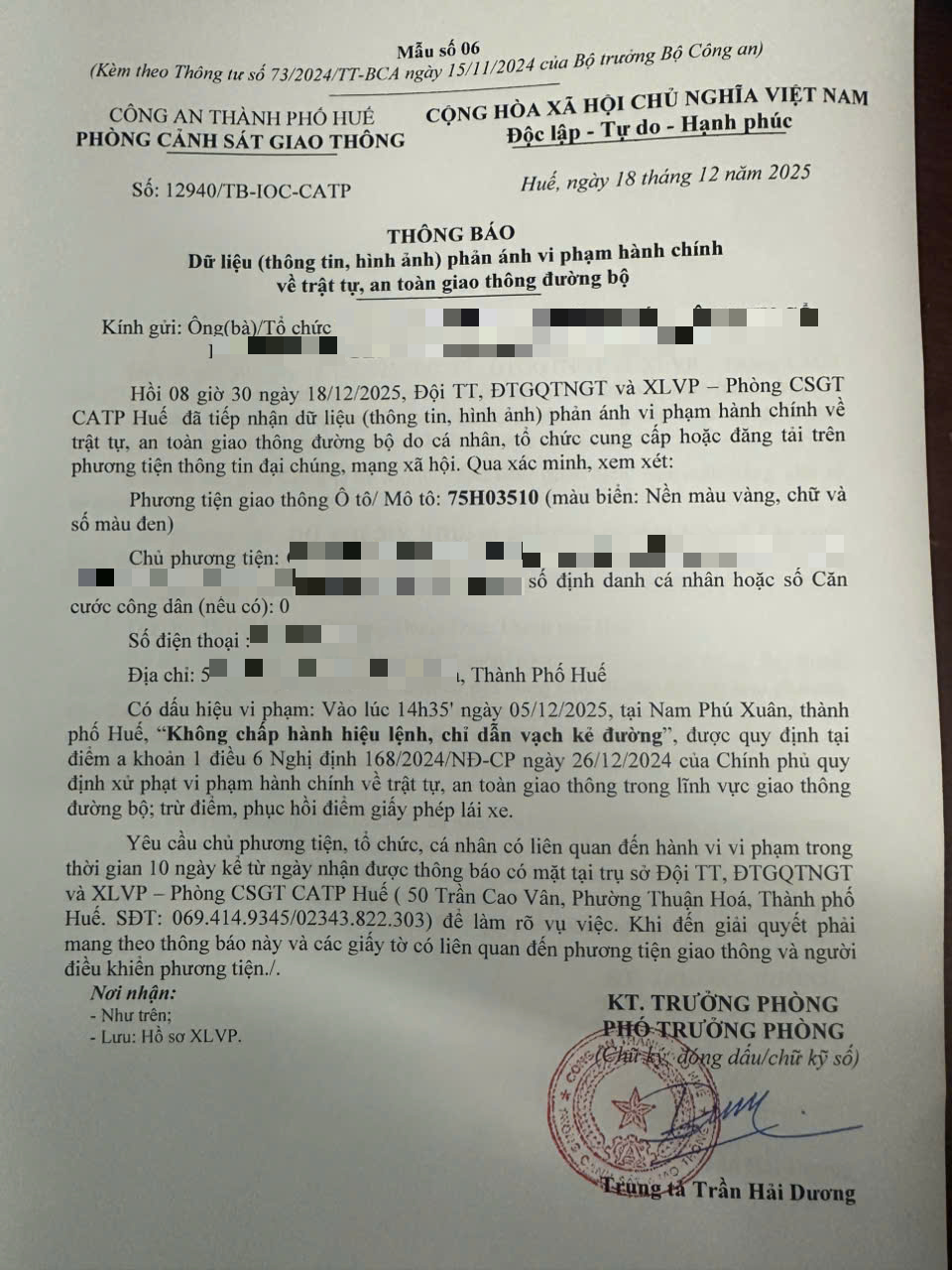 Qua hình ảnh phản ánh, Phòng Cảnh sát giao thông xác định lỗi vi phạm của người điều khiển phương tiện 75H03510 như sau: Không chấp hành hiệu lệnh, chỉ dẫn vạch kẻ đường, được quy định tại Điểm a khoản 1 Điều 6 Nghị định số 168/2024/NĐ-CP ngày 26/12/2024 của Chính phủ.