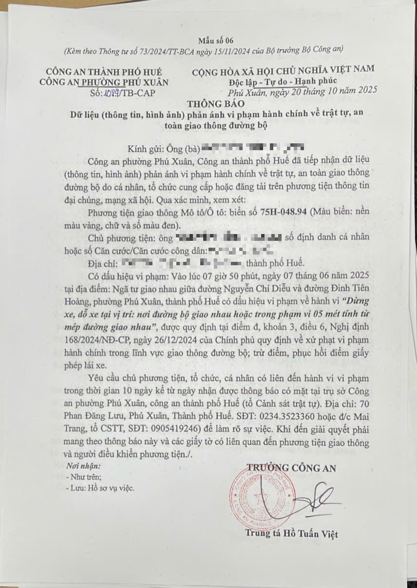 Vào thời điểm trên, xe ô tô mang biển kiểm soát 75H-048.94 đã dừng, đậu xe tại nơi giao nhau, trong phạm vi dưới 5 mét từ mép đường giao nhau, vi phạm nghiêm trọng quy định tại khoản 4 Điều 18 Luật Giao thông đường bộ 2008.