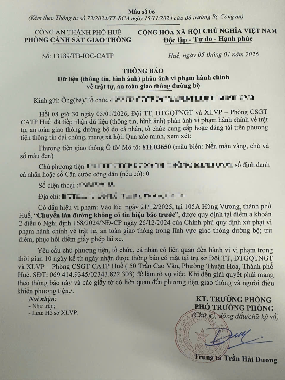 Vấn đề quý Ông/Bà phản ánh, Phòng Cảnh sát giao thông – Công an thành phố Huế đã kiểm tra và xin thông báo kết quả như sau: