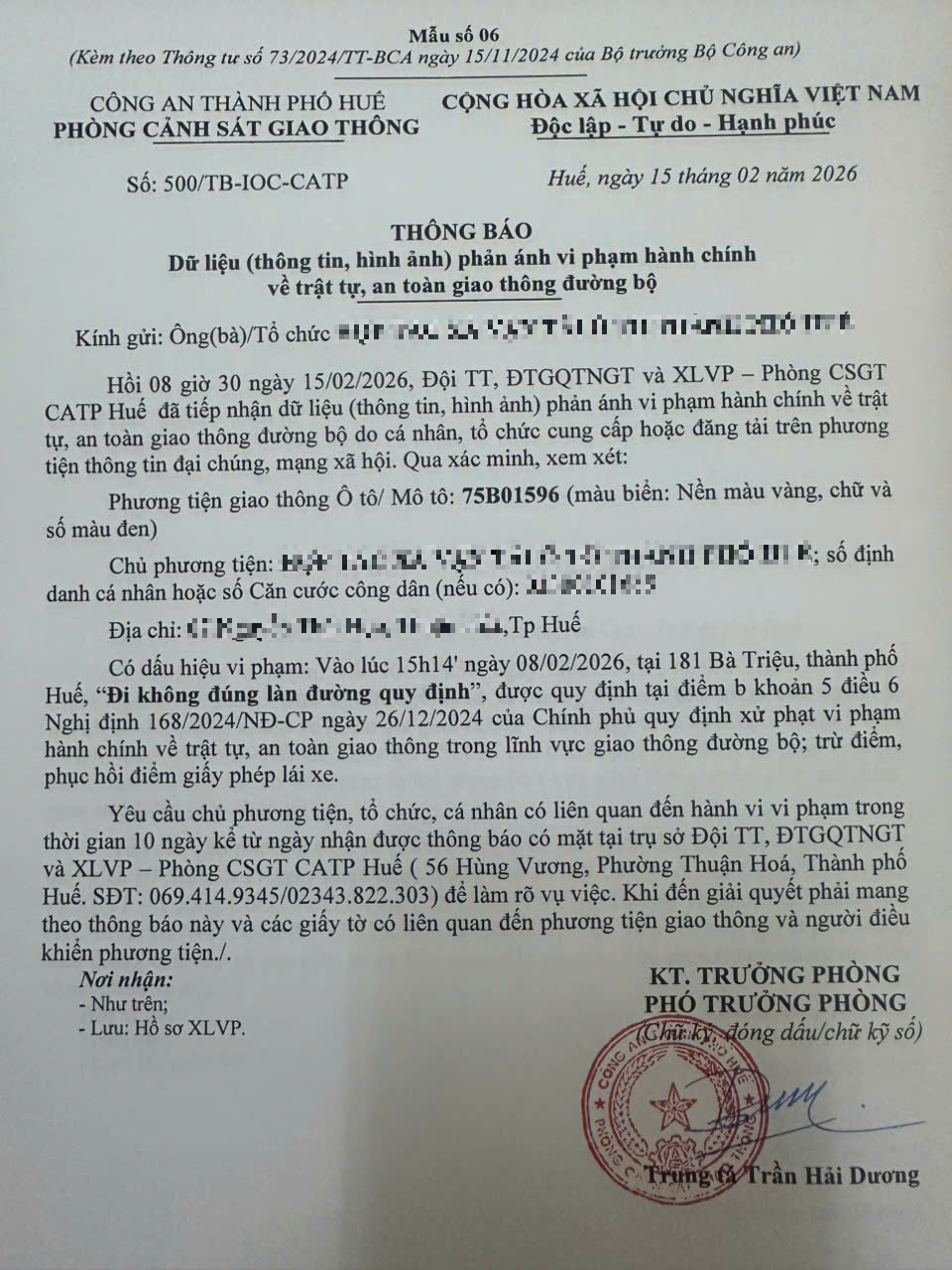 Qua hình ảnh phản ánh, Phòng Cảnh sát giao thông xác định lỗi vi phạm của người điều khiển phương tiện 75B01596 như sau: “Đi không đúng làn đường quy định”, quy định tại điểm b, khoản 5, điều 6 Nghị định 168/2024/NĐ-CP.