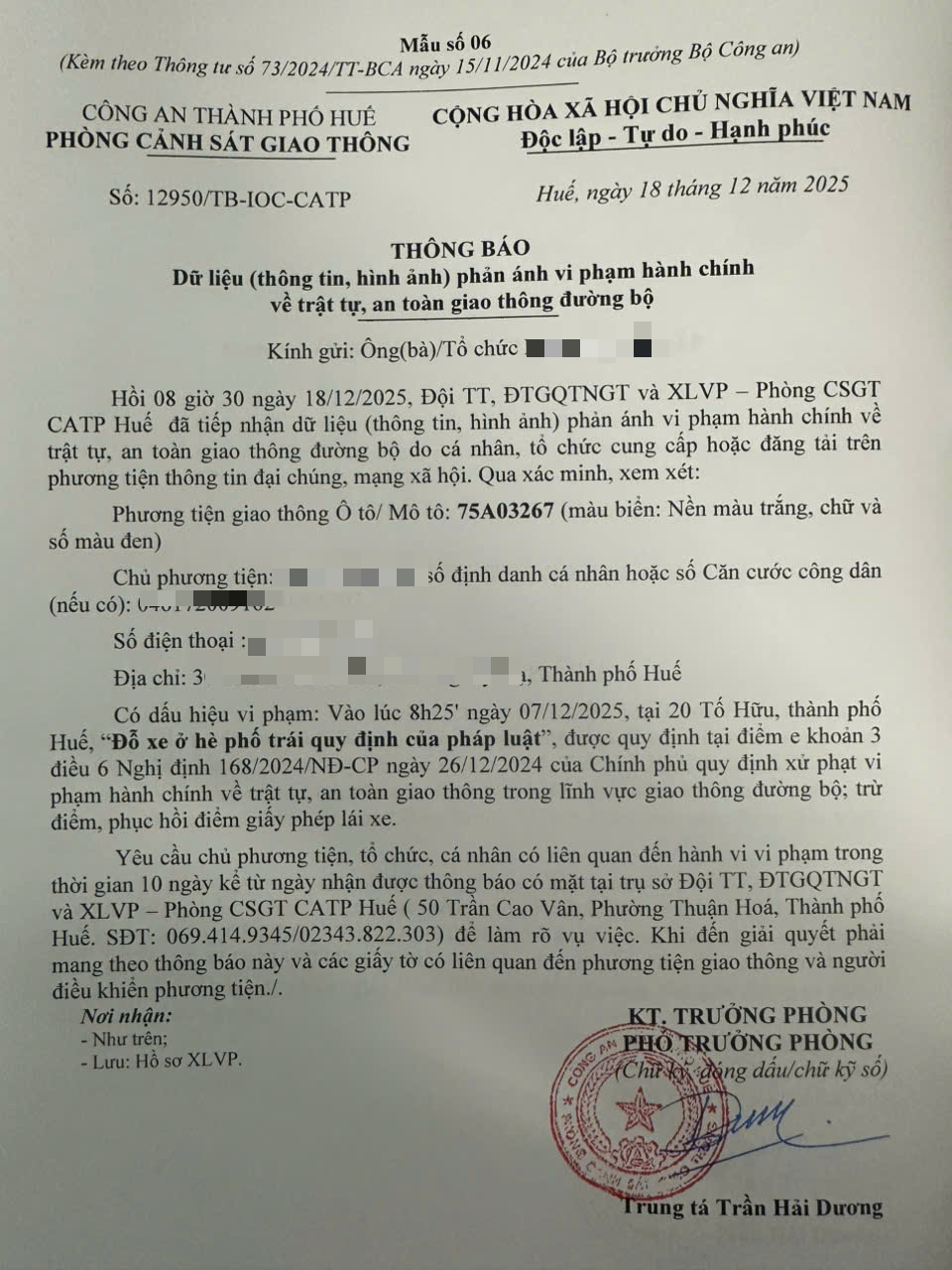 Qua hình ảnh phản ánh, Phòng Cảnh sát giao thông xác định lỗi vi phạm của người điều khiển phương tiện 75A03267 như sau: Đỗ xe ở vỉa hè trái quy định của pháp luật, được quy định tại Điểm e khoản 3 Điều 6 Nghị định số 168/2024/NĐ-CP ngày 26/12/2024 của Chính phủ.