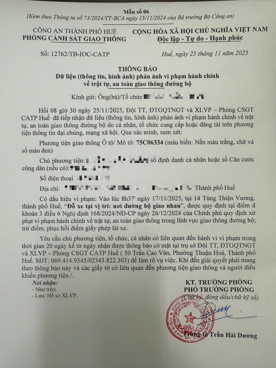 Qua hình ảnh phản ánh, Phòng Cảnh sát giao thông xác định lỗi vi phạm của người điều khiển phương tiện 75C06334 như sau: Dừng xe tại vị trí nơi đường bộ giao nhau, quy định tại điểm đ, khoản 3, điều 6 Nghị định 168/2024/NĐ-CP.
