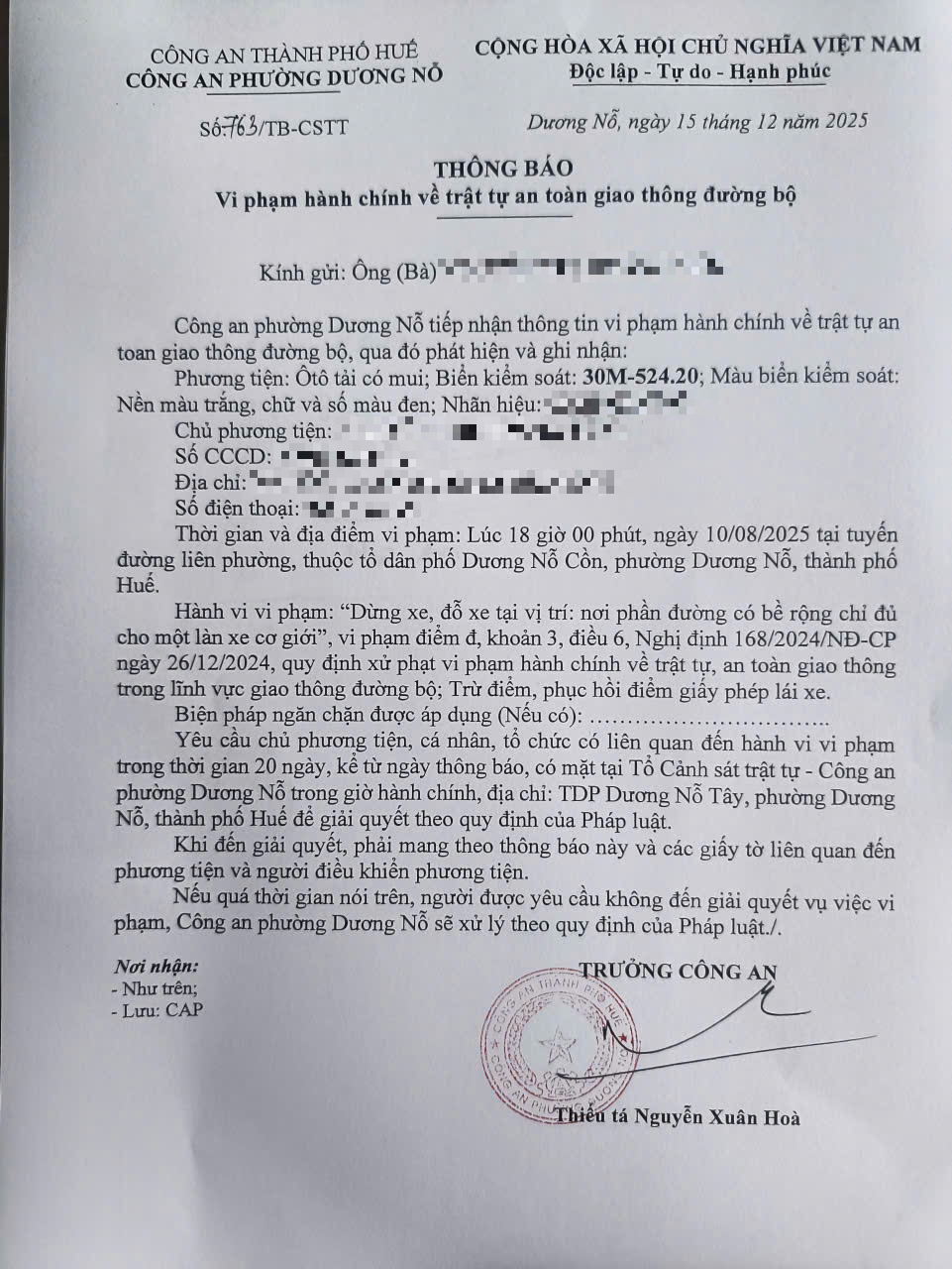 Qua hình ảnh phản ánh, công an phường Dương Nỗ xác định lỗi vi phạm của người điều khiển phương tiện BKS 30M52420 như sau: “Dừng xe, đỗ xe nơi phần đường có bề rộng chỉ đủ cho một làn xe cơ giới” quy định tại điểm đ, khoản 3, Điều 6 Nghị định 168/2024/NĐ-CP ngày 26/12/2024.