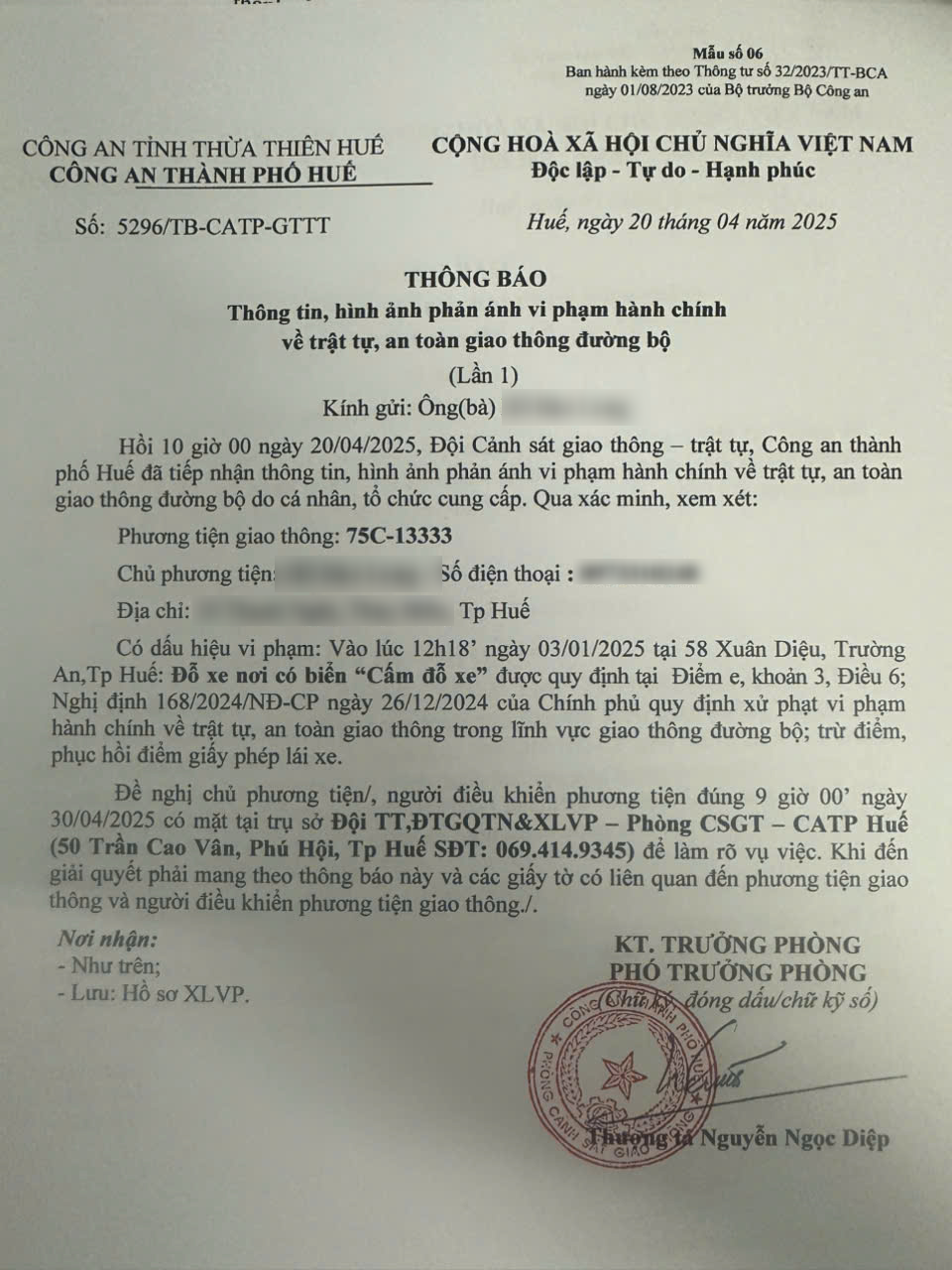 Vấn đề Ông/Bà phản ánh, Công an thành phố Huế đã chỉ đạo Phòng Cảnh sát giao thông kiểm tra và xin thông báo kết quả như sau: