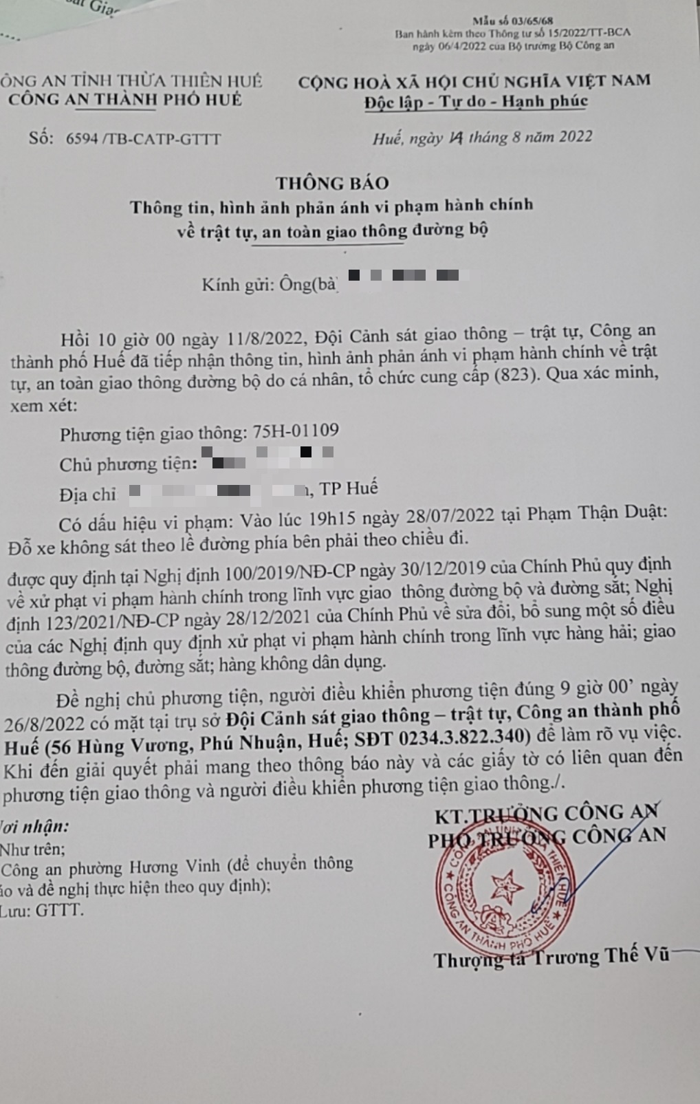 Vấn đề Ông/Bà phản ánh, Công an tỉnh đã chỉ đạo Công an thành phố Huế kiểm tra và trả lời như sau: